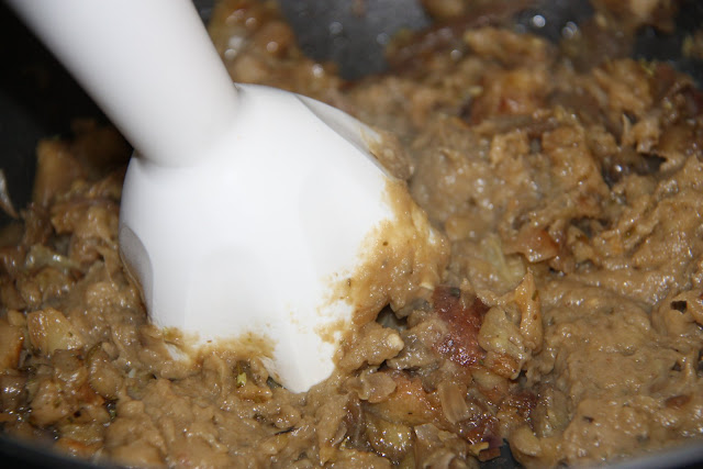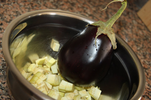 Peleu les albergínies i les cebes i feu-les a trossos petits. Poseu a coure al foc en una paella amb una mica d’oli. Afegiu el grans d’all i el pa, tot tallat a trossets.