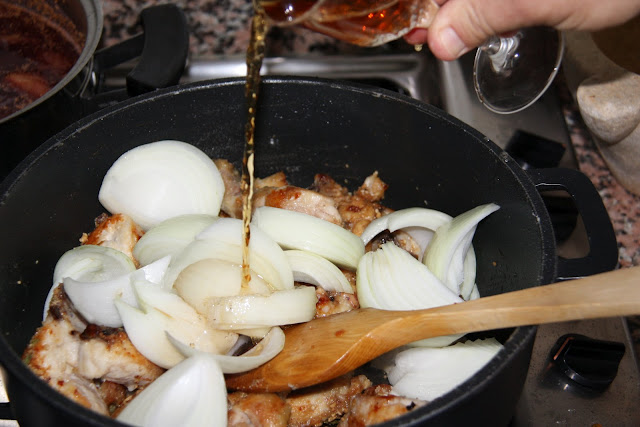 Un cop hagueu fregit tot el pollastre(4), retireu-lo de la cassola i si veieu que encara us queda massa oli, en treieu una mica. Fregiu la picada i un cop hagi agafat color (5), torneu a posar el pollastre i la copeta de conyac (6).