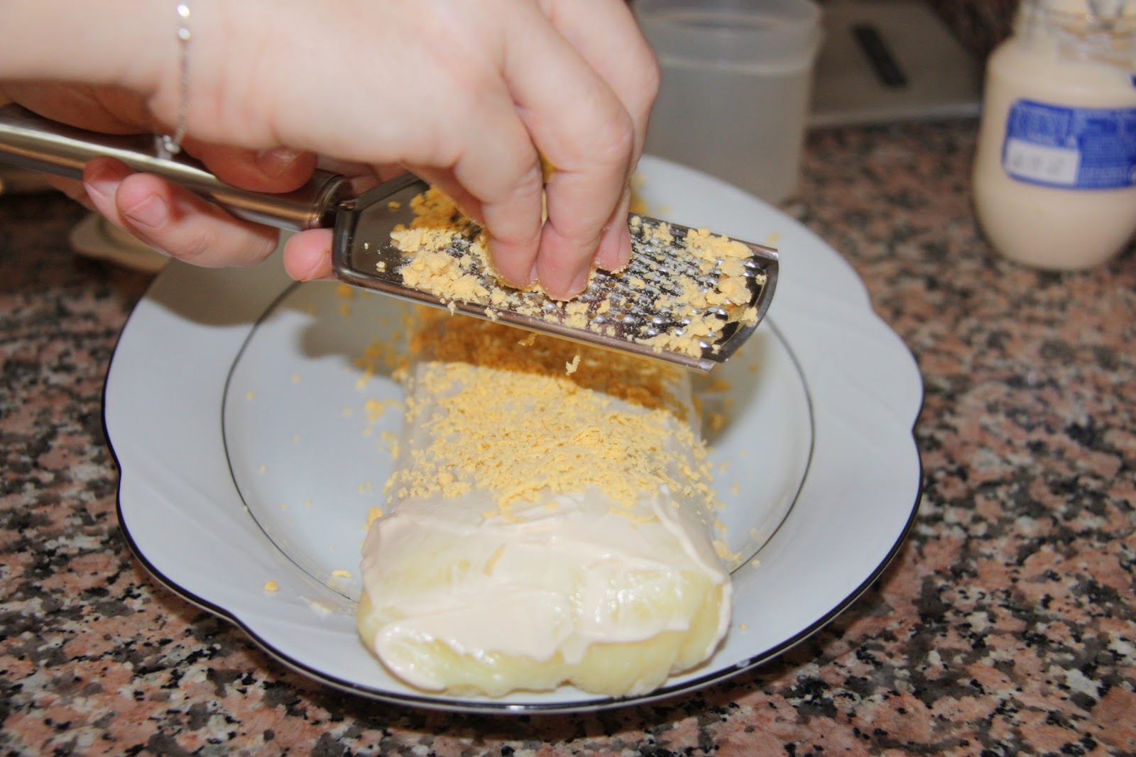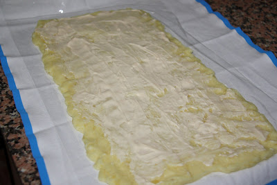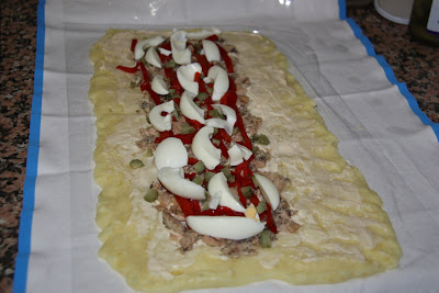 Deixeu refredar una mica i poseu damunt del pedrís un drap net i al damunt una tira de film transparent. Escampeu al damunt la patata fins fer un rectangle de 1/2 cm. de gruix. Poseu al damunt una mica de maionesa, no molta.