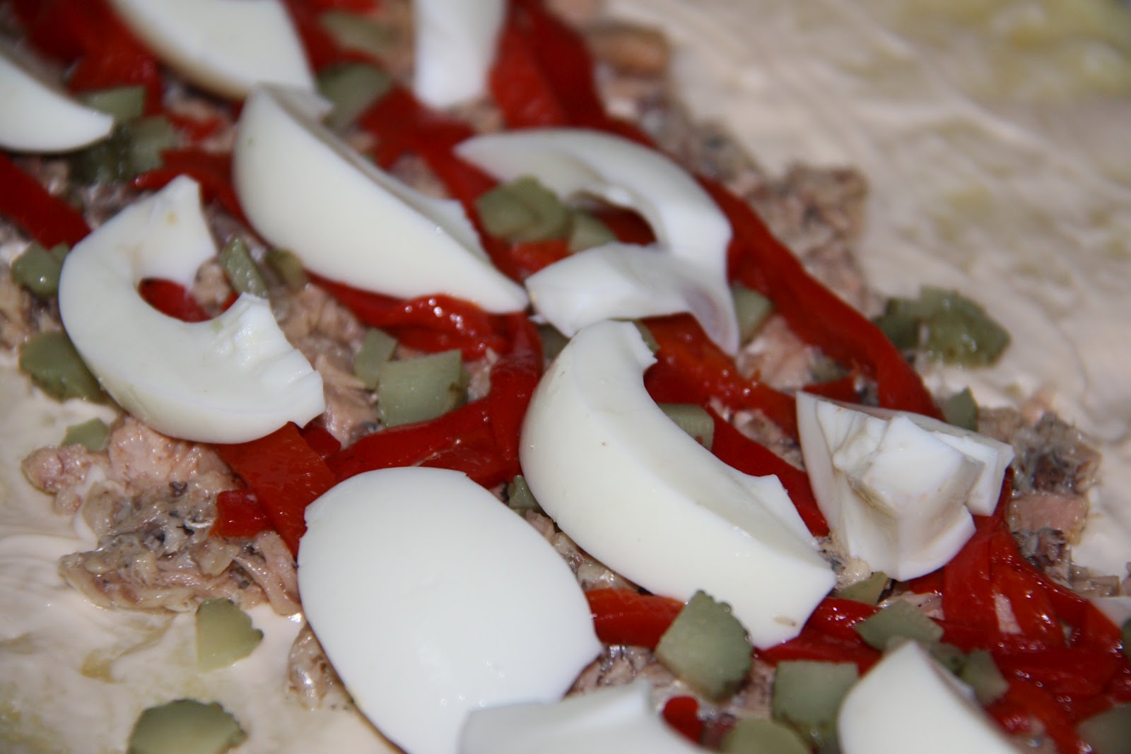 Repartiu la tonyina, el pebrot, la clara dels ous durs (el rovell l’utilitzarem per decorar) i uns cogombrets en vinagre tallats petits. Hi podeu afegir tàperes, surimi, anxoves, olives farcides, el que vulgueu però personalment no m’agrada barrejar tants sabors, prefereixo pocs ingredients per trobar el gust de cada cosa.