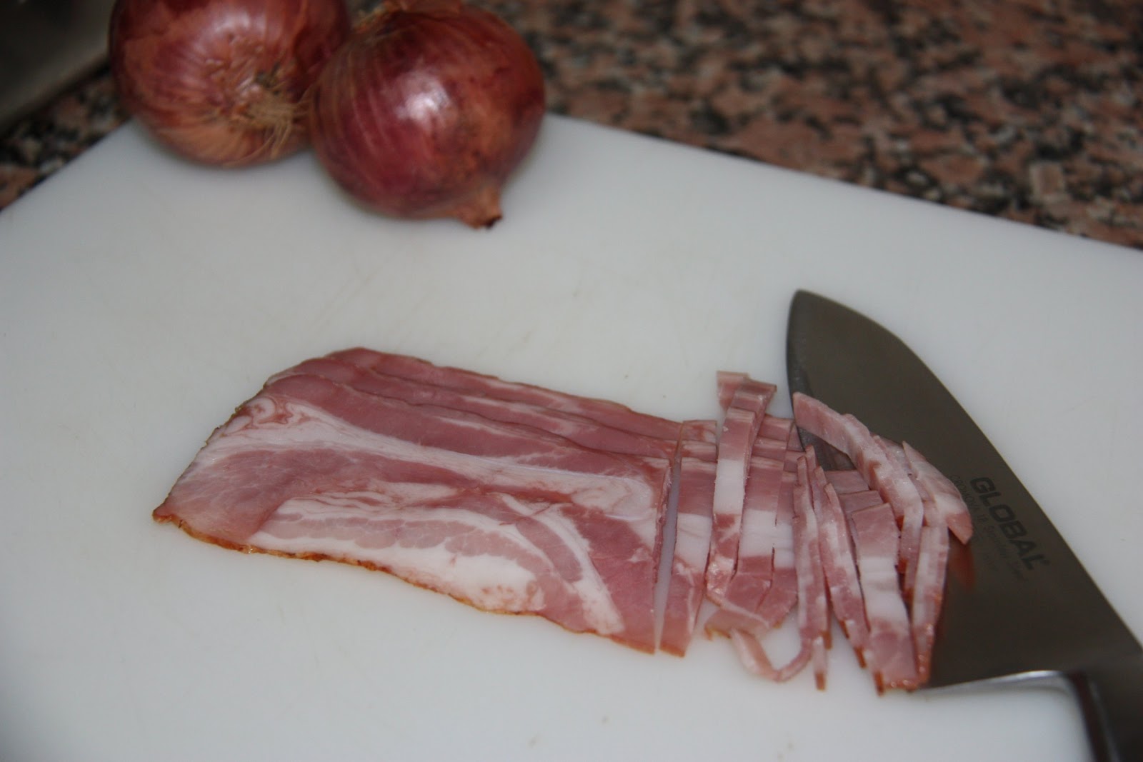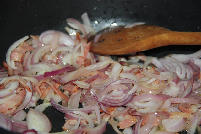 Si no tenim bacó, podem fer-ho amb pernil o amb unes tiretes de pollastre o fins i tot, podem eliminar-lo dels ingredients, encara que el bacó fumat li dona un contrast molt agradable amb les panses i la ceba, que queda cruixent.
