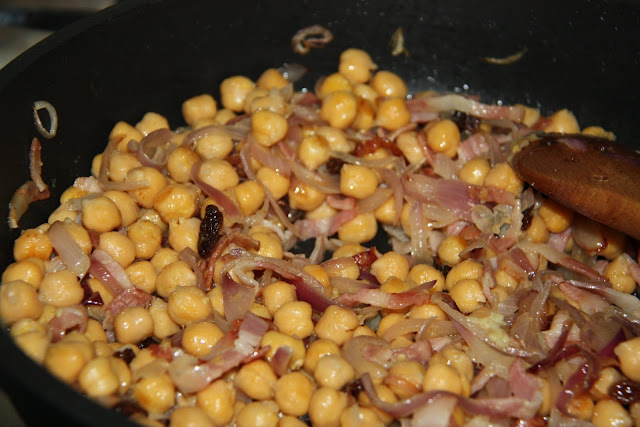 Aquesta recepta és ideal per a aquells dies que arribes tard a casa i tens poc temps per preparar el dinar. Hem de procurar tindre un rebost ben proveït, com a mínim pel que fa a productes bàsics. Un pot de cigrons, cebes al verduler, unes panses, això està sempre present a la majoria de cases.