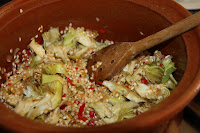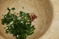 Trinxeu la ceba, el primentó, un gra d’all, una mica de julivert i el tomàquet. Comenceu a fer el sofregit en el mateix ordre. Mentrestant feu la picada amb l’altre gra d’all, el julivert i uns brins de safrà. Reserveu-la.