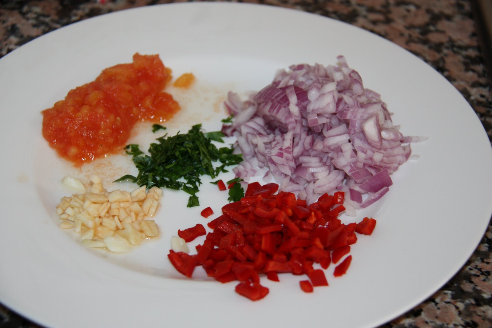 Trinxeu la ceba, el primentó, un gra d’all, una mica de julivert i el tomàquet. Comenceu a fer el sofregit en el mateix ordre. Mentrestant feu la picada amb l’altre gra d’all, el julivert i uns brins de safrà. Reserveu-la.