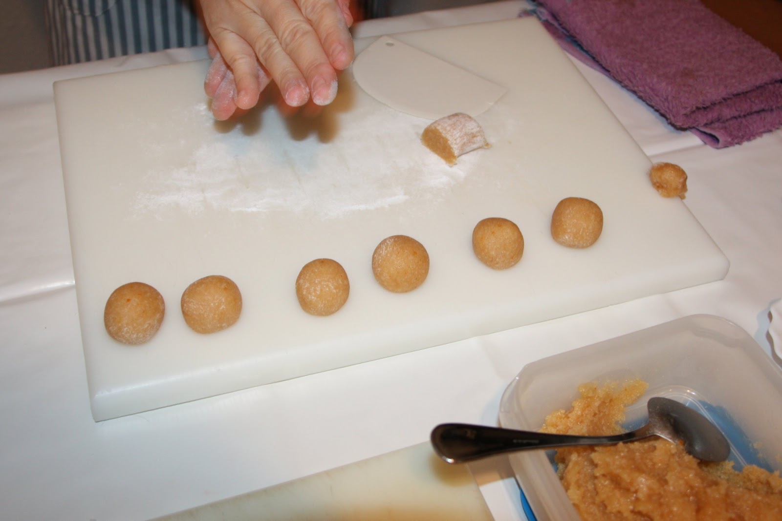 Nota: per a que els pinyons o els trocets d’ametlla s’adhereixen bé al panellet, a casa ho hem d’aquesta manera: fem les boletes amb la massa, les passem per clara d’ou i les deixem reposar una estona, 15 o 20 minuts. Passem les boletes pels pinyons i li acabem de donar forma.