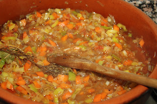 Saleu i empebreu la carn. Enfarineu-la lleugerament. Fregiu-la en una cassola de fang amb una mica d’oli d’oliva. Reserveu. En el mateix oli fregiu la ceba, el porro i la carlota. Afegiu el llorer i la frígola. Incorporeu el tomàquet triturat. Quan les verdures estiguin fetes, afegiu el vi blanc. Deixeu evaporar l’alcohol i afegiu la