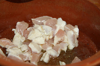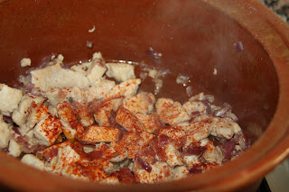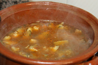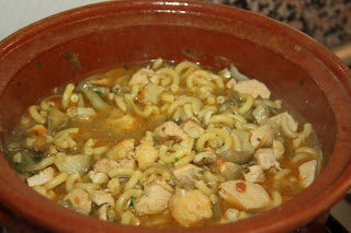 Poseu una mica d’oli d’oliva en una cassola de fang. Talleu el pit de pollastre a daus i l’enrossiu a la cassola. Afegiu la ceba trinxada. Quan la ceba hagi agafat color, afegiu l’all, doneu-li dues voltes i afegiu el pebre roig. Després, el julivert i el tomàquet. Quan el sofregit estigui fet, poseu el bròquil i la carxofa. Doneu-li un parell de voltes i afegiu el brou de pollastre calent. Deixeu bullir durant uns 10 o 12 minuts. Passat aquest temps, afegiu els fideus i ho deixeu coure fins que estiguin cuits (en aquest cas uns 9 minuts).