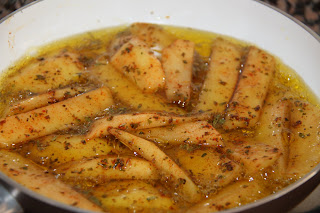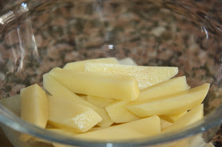 Netegeu i peleu les patates. Talleu-les a tires més aviat gruixudes. Poseu-les en un bol i incorporeu les espècies al vostre gust. Poseu més quantitat de l’espècie que més us agradi, a mi m’agrada posar molta nou moscada (això sí, ratllada al moment, és molt més aromàtica). Si us agrada el picant podeu posar-li pebre roig picant o una mica de tabasco.