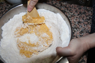 Feu un volcà amb el sucre i l’ametlla i al mig afegiu els rovells d’ou.