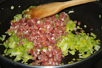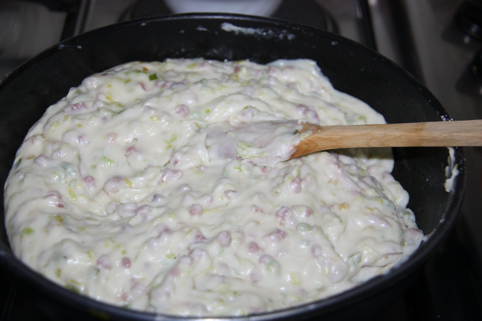 Afegiu el pernil i el porro, barregeu bé i reserveu en un recipient.