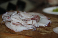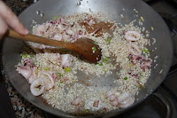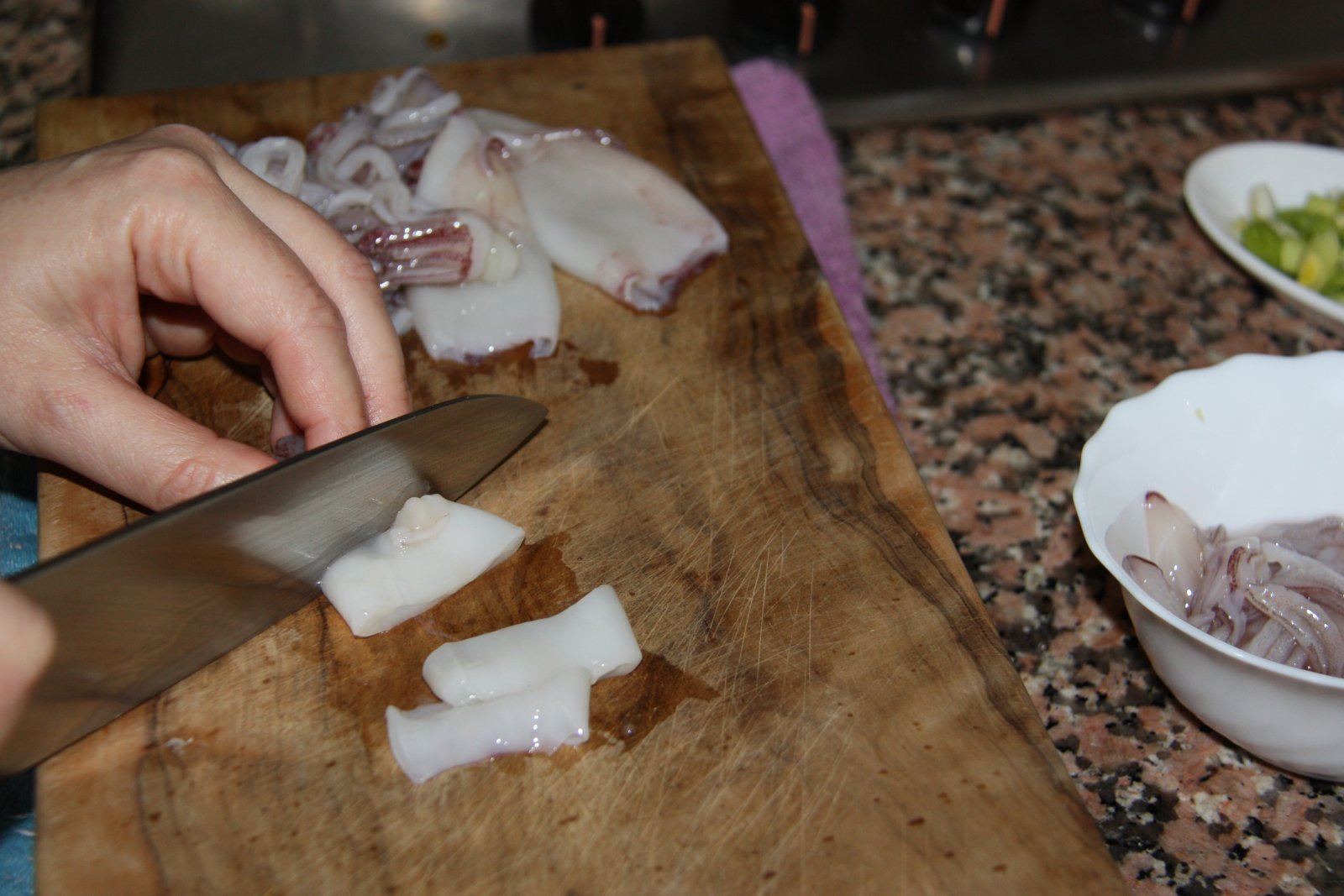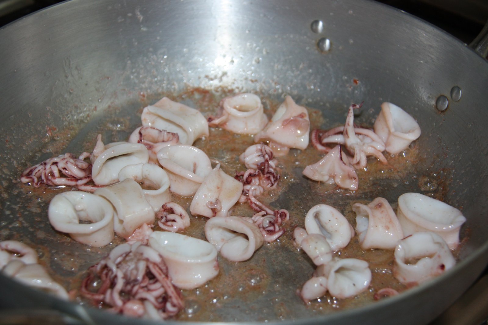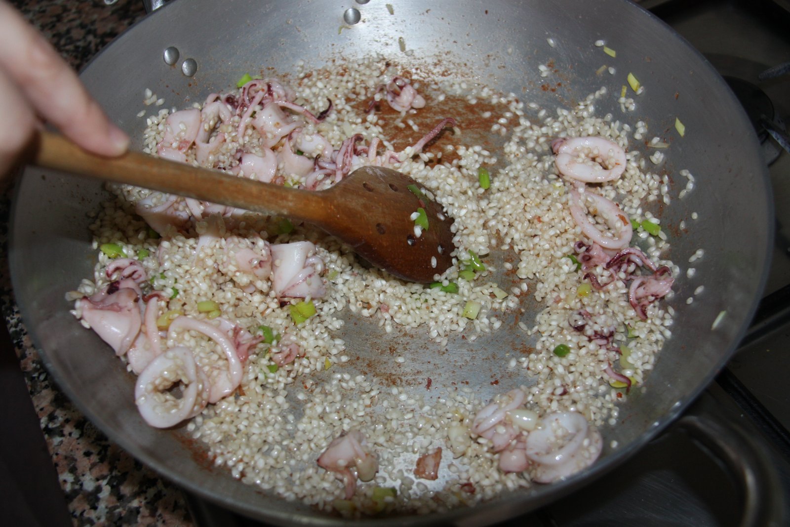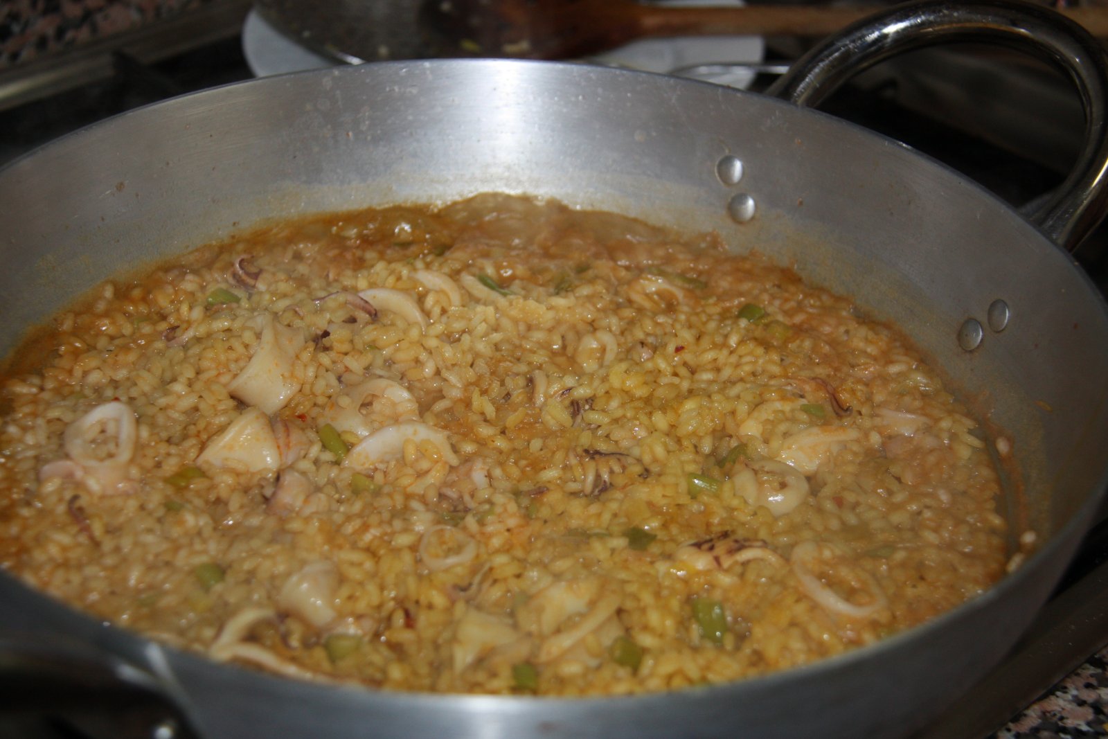 Per fer l’arròs poseu oli en una paella i salteu els calamarsons i els reserveu en un plat. Aprofiteu el mateix oli per fregir a foc lent els alls tendres. Quan hagin començat a daurar-se, afegiu l’arròs i l’aneu remenant juntament amb els alls. Incorporeu els calamarsons i el brou. Piqueu el safrà en el morter i el deixateu amb una mica de brou. Ho afegiu a la paella amb l’arròs.