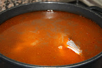 En el mateix oli sofregiu el tomàquet a foc lent. Incorporeu el peix de fer caldo i l’aigua. Ho deixeu bullir (aneu escumant) durant una mitja hora. a mitja cocció hi afegiu la picada de nyores i alls.