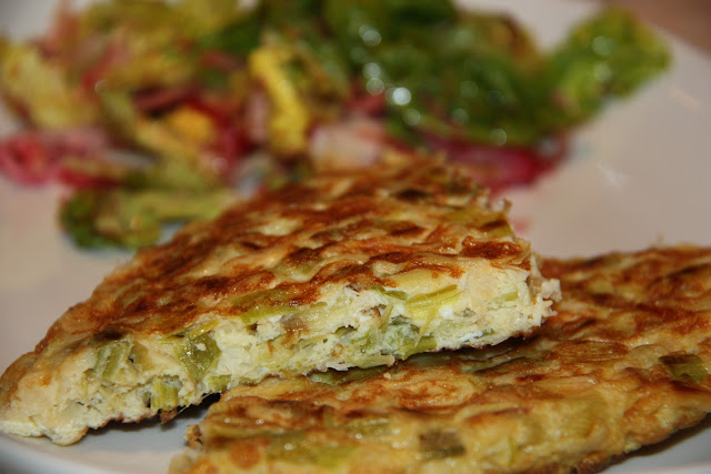 El diumenge vaig fer abajedo en suc i vaig reservar un troç d’abadejo per fer una truita amb porros. Qualsevol tipus de truita és un recurs ràpid i fàcil de preparar per a sopar. A més, si teniu el temps just, sempre la podeu deixar preparada i calentar una mica al microones.