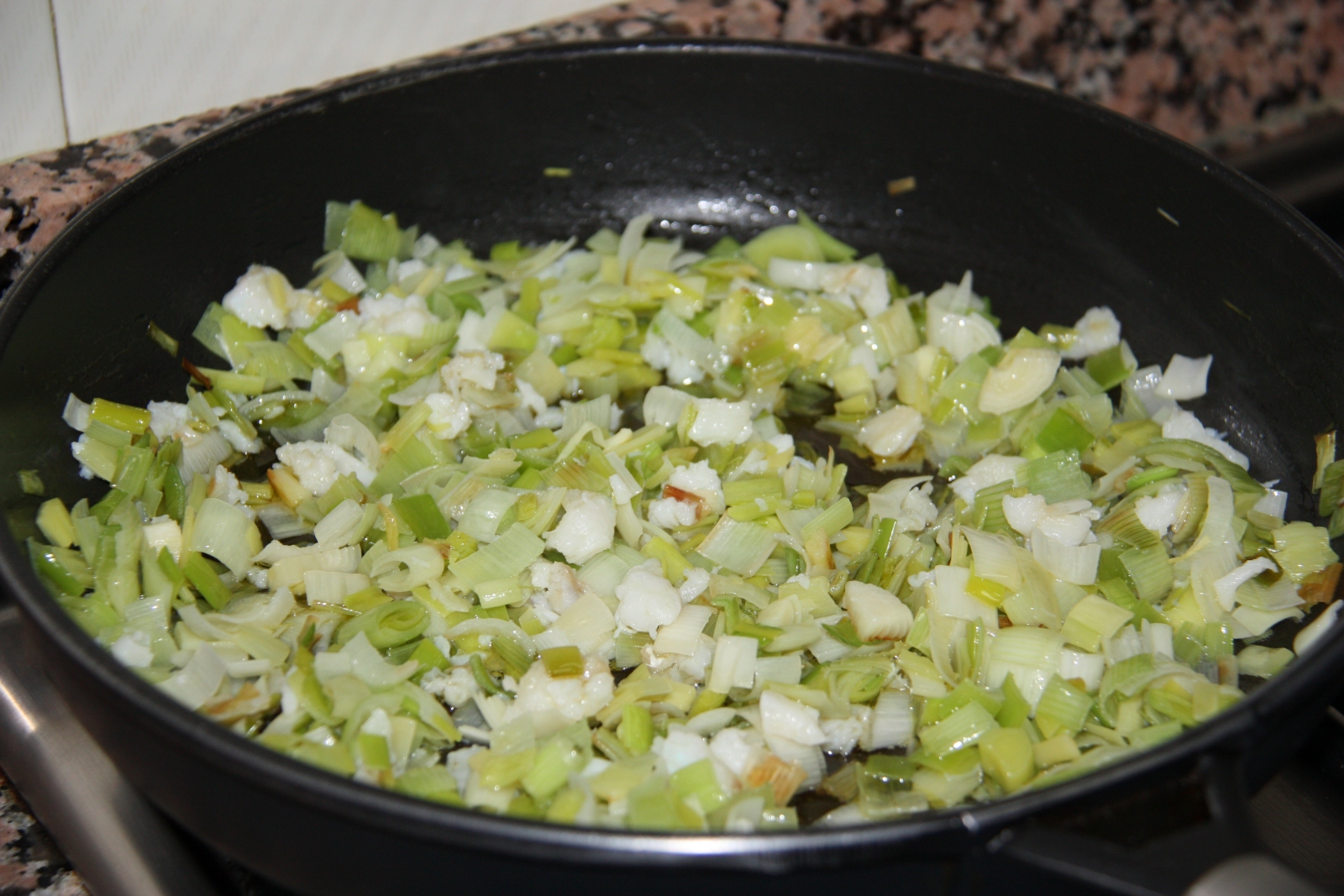 Dessaleu bé l’abadejo. Talleu a trossos menuts els porros i poseu-los en una paella al foc amb una mica d’oli d’oliva. Esmicoleu l’abadejo i l’afegiu a la paella. Ho deixeu coure fins que estigui daurat.