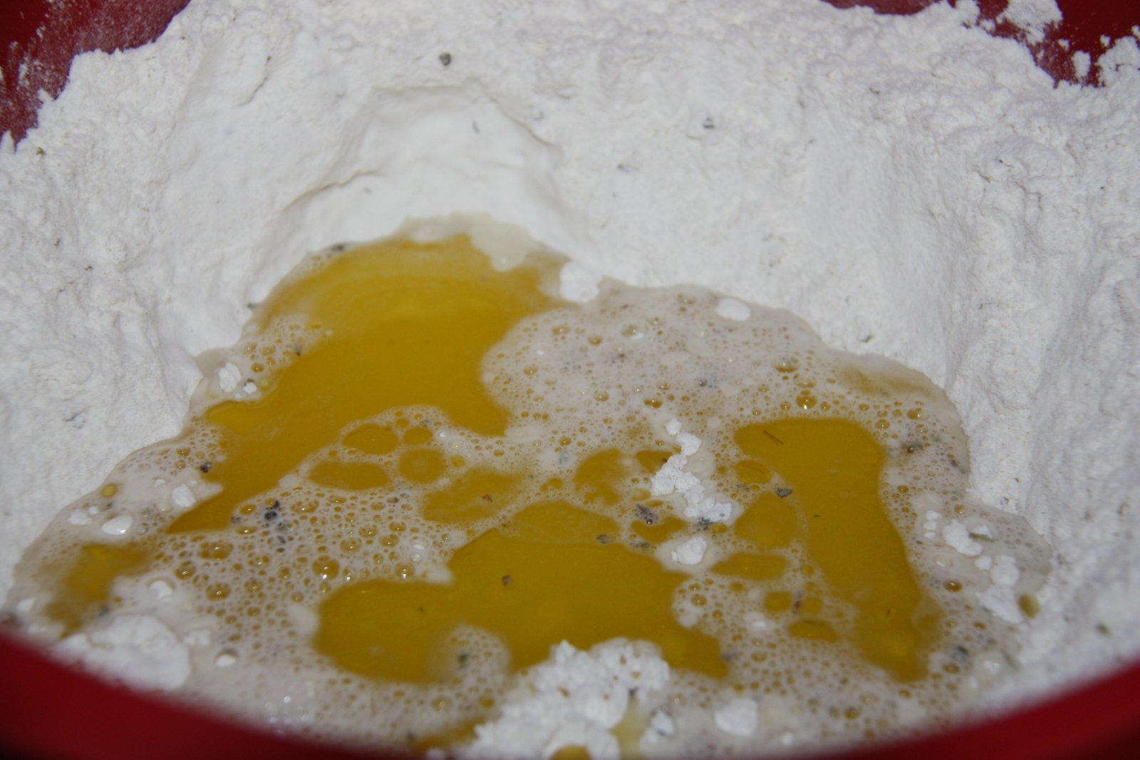 Poseu la farina en un bol, afegiu la sal i l’orenga. Barregeu. Afegiu l’oli i l’aigua i la massa mare que teníem reservada. Treballeu la massa i si us fa falta,a fegiu una mica de farina, però no més de la necessària. Aboqueu la massa al pedrís i treballeu-la durant 15 o 20 minuts.