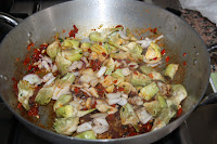 En el mateix oli ofegueu el primentó roig durant tres o quatre minuts. Afegiu els alls trinxats, el julivert i al cap d’un momentet, els tomàquets ratllats.