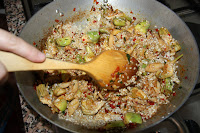 Afegiu l’arròs i barregeu bé amb el sofregit durant tres minuts més. Afegiu el brou de peix ben calent i manteniu a foc viu durant uns 10 minuts.