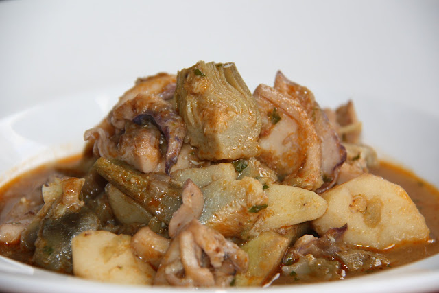 Quan el tomàquet sigui cuit, afegiu les patates esverlades i les carxofes. Doneu-li un parell de voltes i cobriu d’aigua.