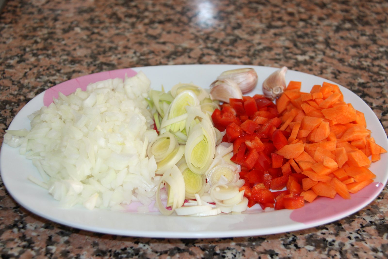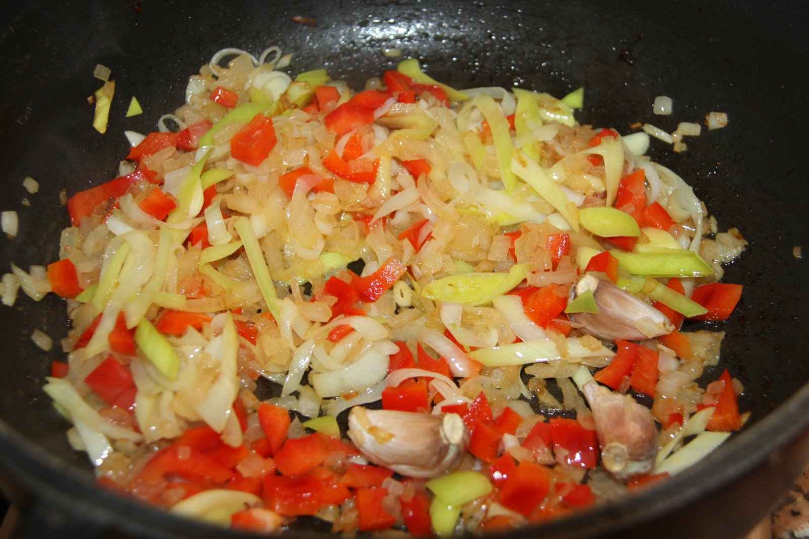 Treieu l’excés d’oli i de la cassola i comenceu a coure la ceba a foc lent. Quan comenci a canviar de color, afegiu el porro i després els alls sencers amb pell, el primentó i per últim, les carlotes.