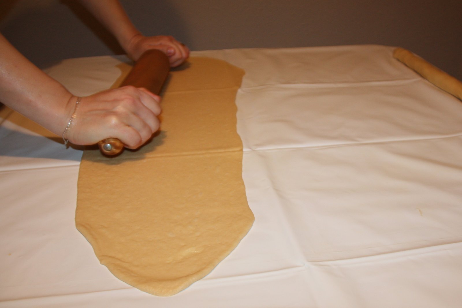 Esteneu la meitat de la massa damunt d’un pedrís o taula (que haureu untat amb una mica d’oli, el mateix fareu amb les vostres mans). Estireu la massa amb l’ajuda d’un corró fins a fer un rectangle, la massa ha de quedar ben fina (si algun troç es trenca no passa res).