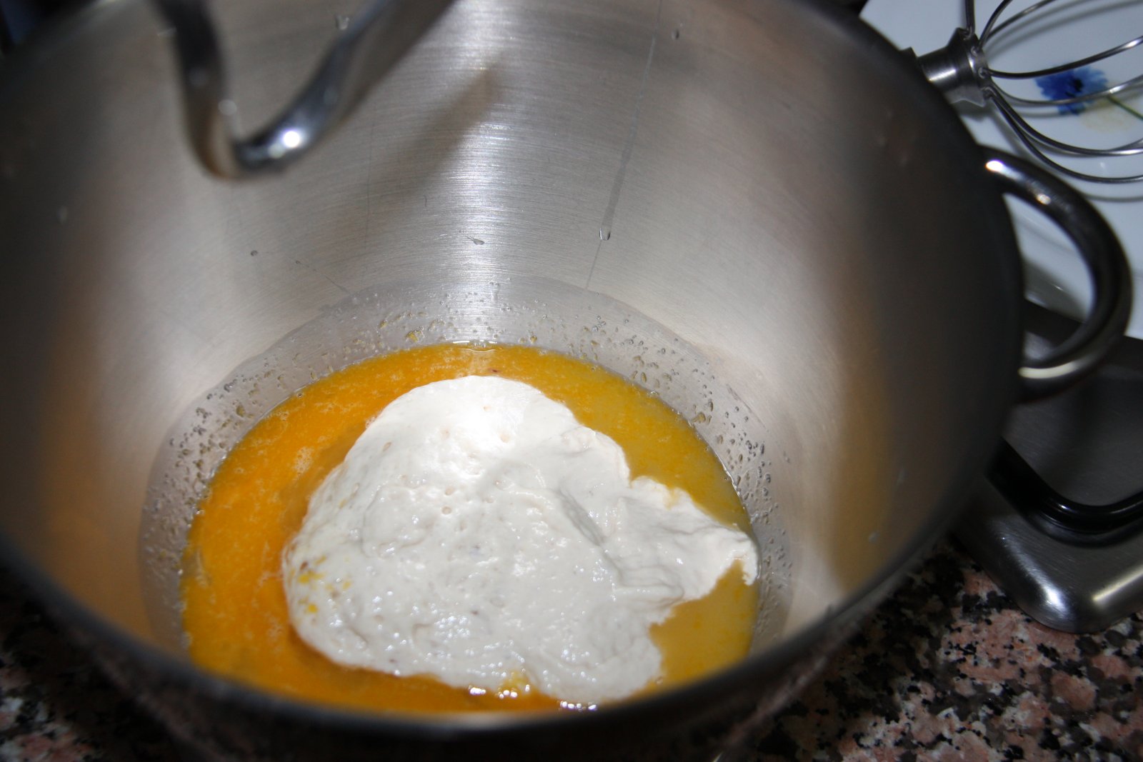 En un altre bol mescleu els ous, l’aigua i el sucre i quan estigui barrejat, afegiu la massa mare. Treballeu un parell de minuts i aneu afegint la farina. Jo ho vaig fer amb l’amassadora elèctrica i vaig amassar-la a velocitat moderada durant uns 15 minuts.