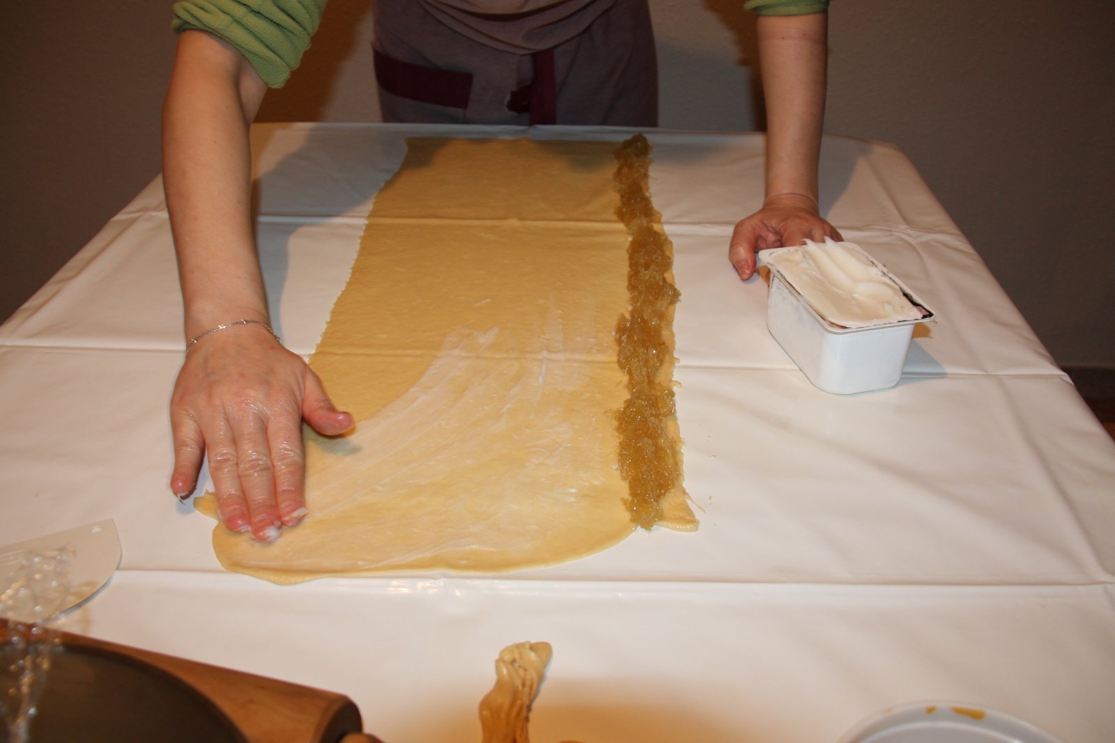 Escampeu amb les mans el sagí per tota la superfície, estireu i enrotlleu la massa com podeu veure a la imatge.