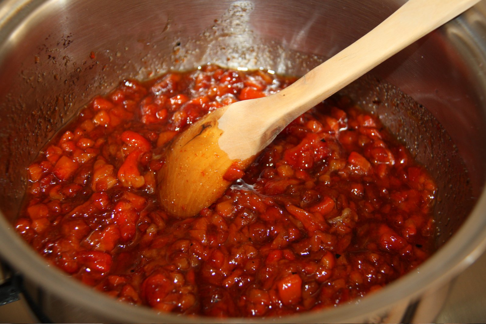 Poseu la barreja en un casso i ho poseu a coure a foc suau durant 30 minuts. Si és per a consum en dos o tres dies, guardeu a la nevera, si en feu més quantitat, envaseu en pots esterilitzats i coeu al bany maria durant 20 minuts.