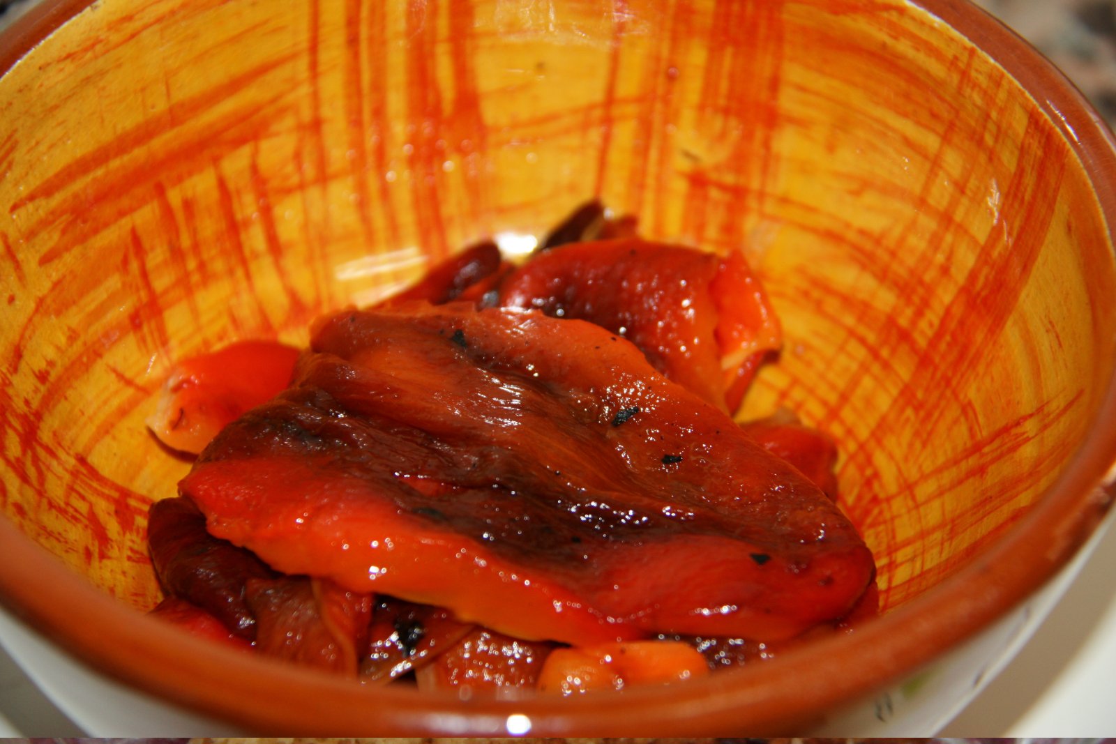 Escaliveu els primentons. deixeu refredar i netegeu de pell i llavors. Talleu-los a trossets i poseu-los en un bol amb el sucre. Deixeu-ho un parell d’hores a la nevera, per a que el subre vagi caramelitzan els primentons.