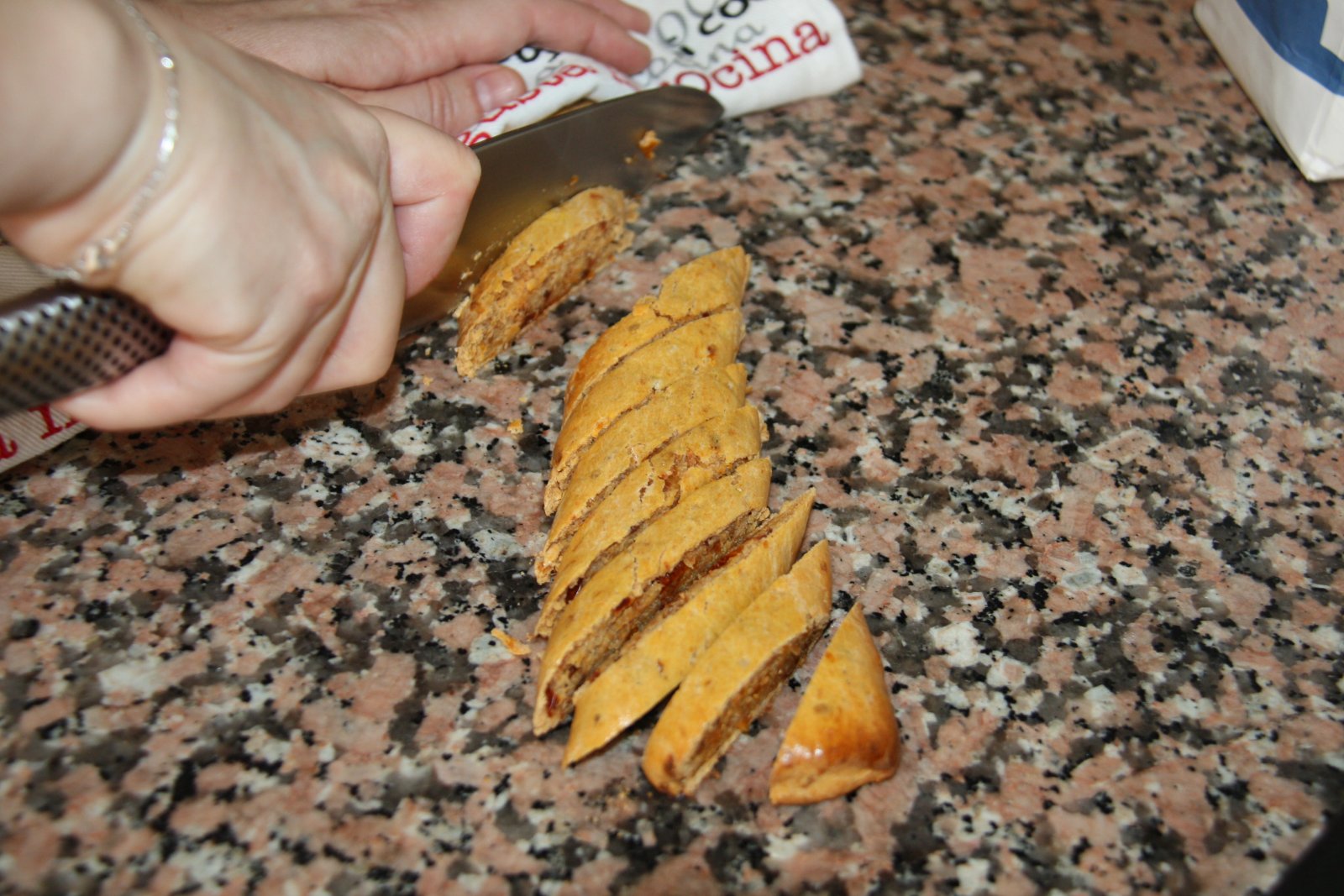 coeu al forn durant uns 15 minuts a 180º. Retireu la llauna i amb compte de no cremar-vos, talleu les barretes a llesques. Torneu a posar les llesques al forn fins que estiguin ben cruixents, uns 7 minuts.