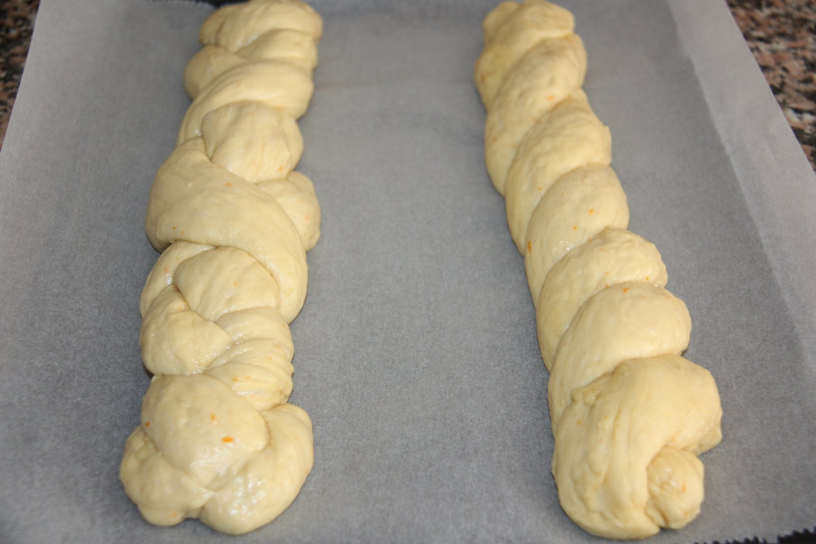 Dividiu la massa en dos. De cadascuna de les dues parts, en feu una trena, que posareu damunt d’una llauna.