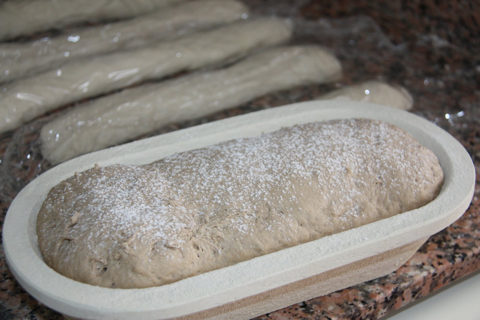 Agafeu la massa i amasseu uns segons per eliminar l’aire de fermentació. Doneu-li forma de pa allargat i poseu en un motlle, en aquest cas un banetone (recipient fet amb pasta de fusta especial per llevar el pa).