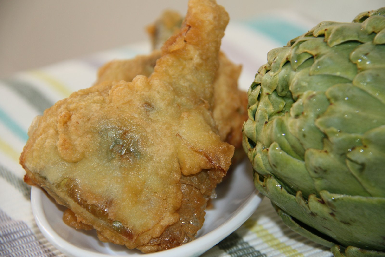 Refredem les carxofes en aigua freda, les deixem escórrer i les passem per una massa lleugera que preparem amb una mica d’ou, farina, sal i pebre i un xorret de sifó.