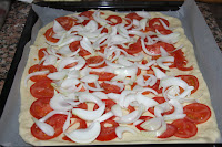 Esteneu la massa, no ha de quedar prima com una pizza, sinó que una mica més gruixuda perquè a sobre li posem molts d’ingredients;  poseu-la en una llauna per anar al forn. Talleu els tomàquets (no cal pelar) a rodanxes ben fines i repartiu-los per la coca. Talleu la ceba i feu el mateix.