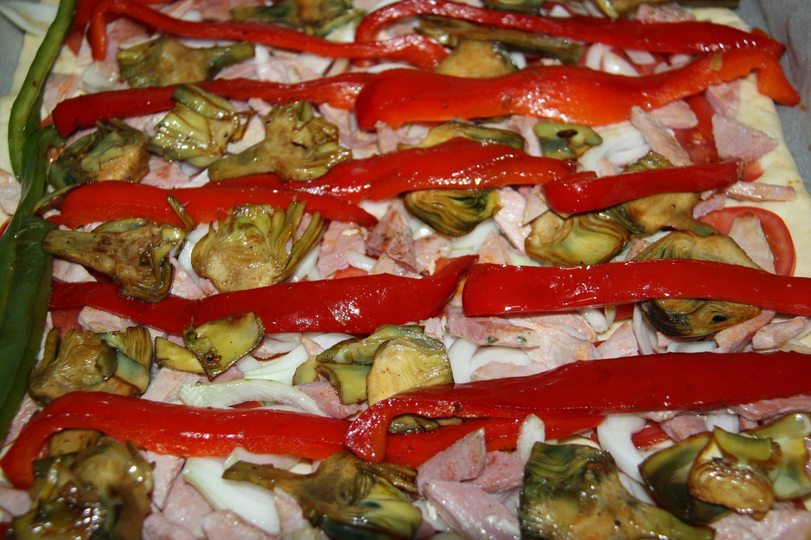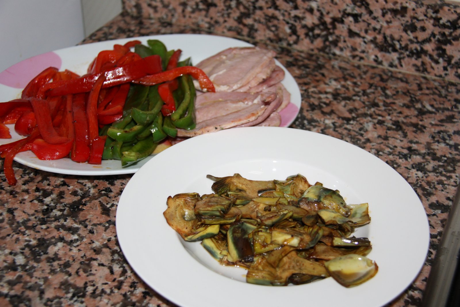 Mentre la massa reposa, talleu els primentons a tires gruixudes i passeu-los per una paella amb oli durant uns minuts; feu el mateix amb el llom i amb la carxofa, que haureu tallat a làmines fines.