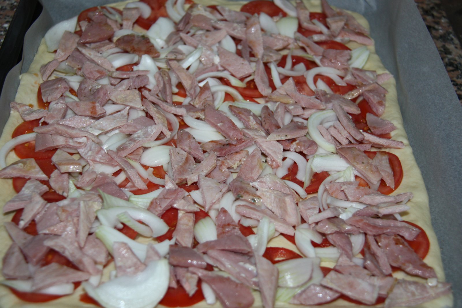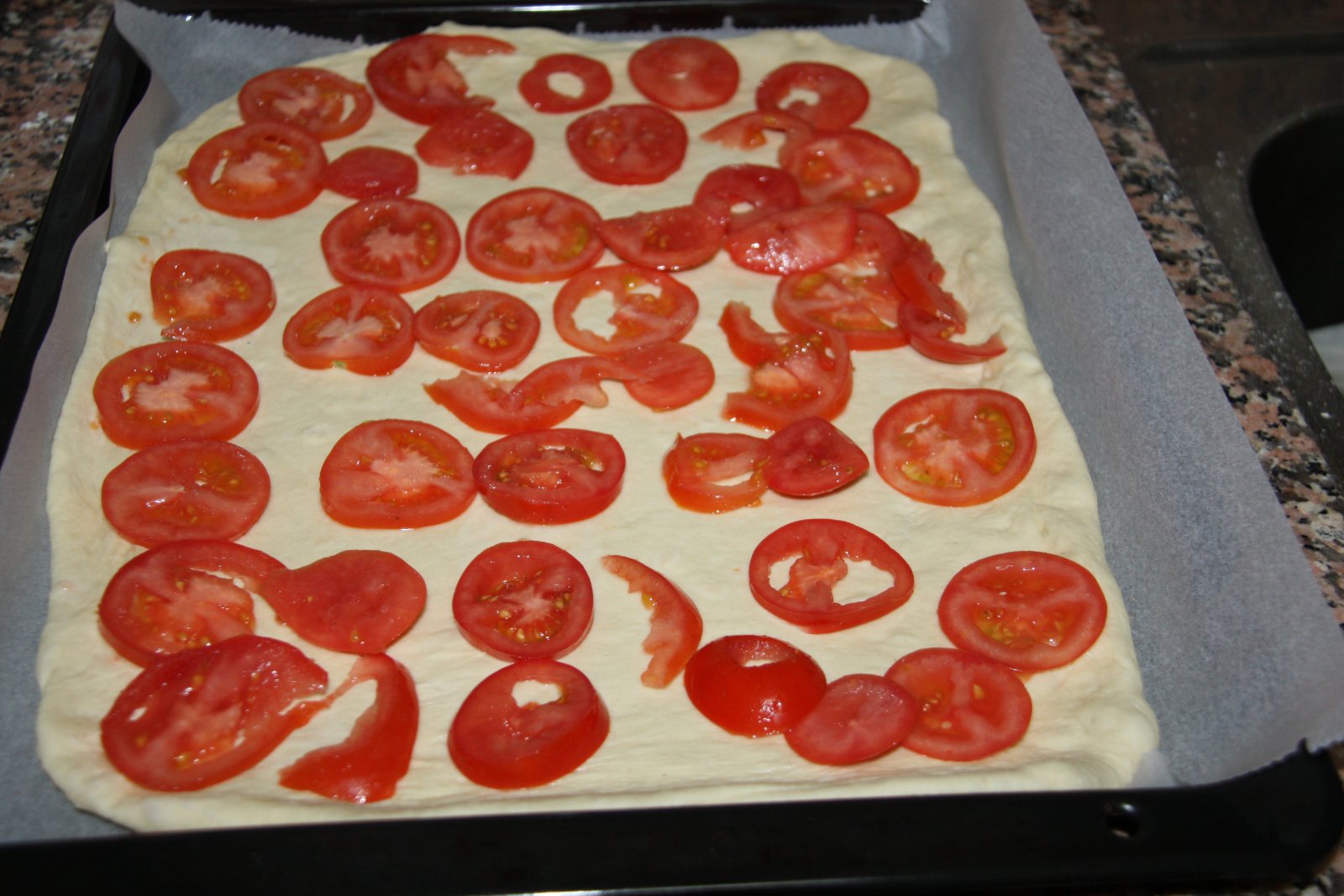 Esteneu la massa, no ha de quedar prima com una pizza, sinó que una mica més gruixuda perquè a sobre li posem molts d’ingredients;  poseu-la en una llauna per anar al forn. Talleu els tomàquets (no cal pelar) a rodanxes ben fines i repartiu-los per la coca. Talleu la ceba i feu el mateix.