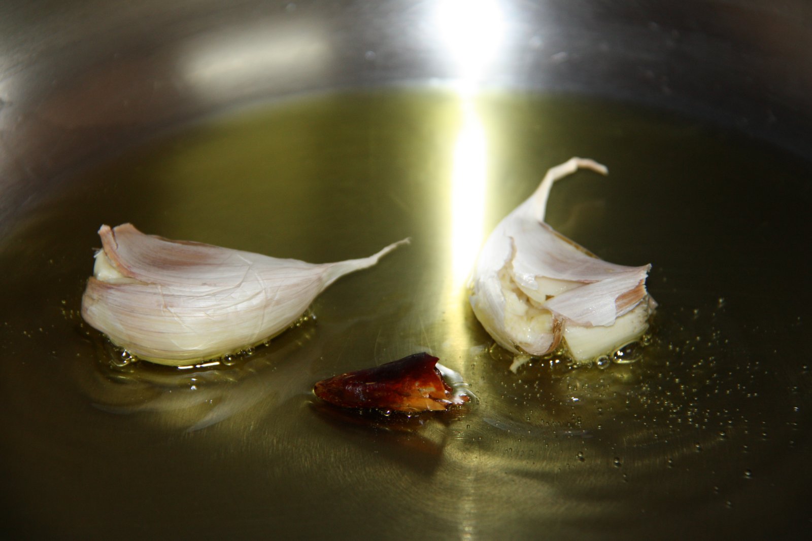Netegeu els musclos i renteu bé. Poseu una cassola al foc amb un bon raig d’oli d’oliva. Afegiu un parell de grans d’all amb pell i aixafats amb un cop de mà i la punta de pesteta.