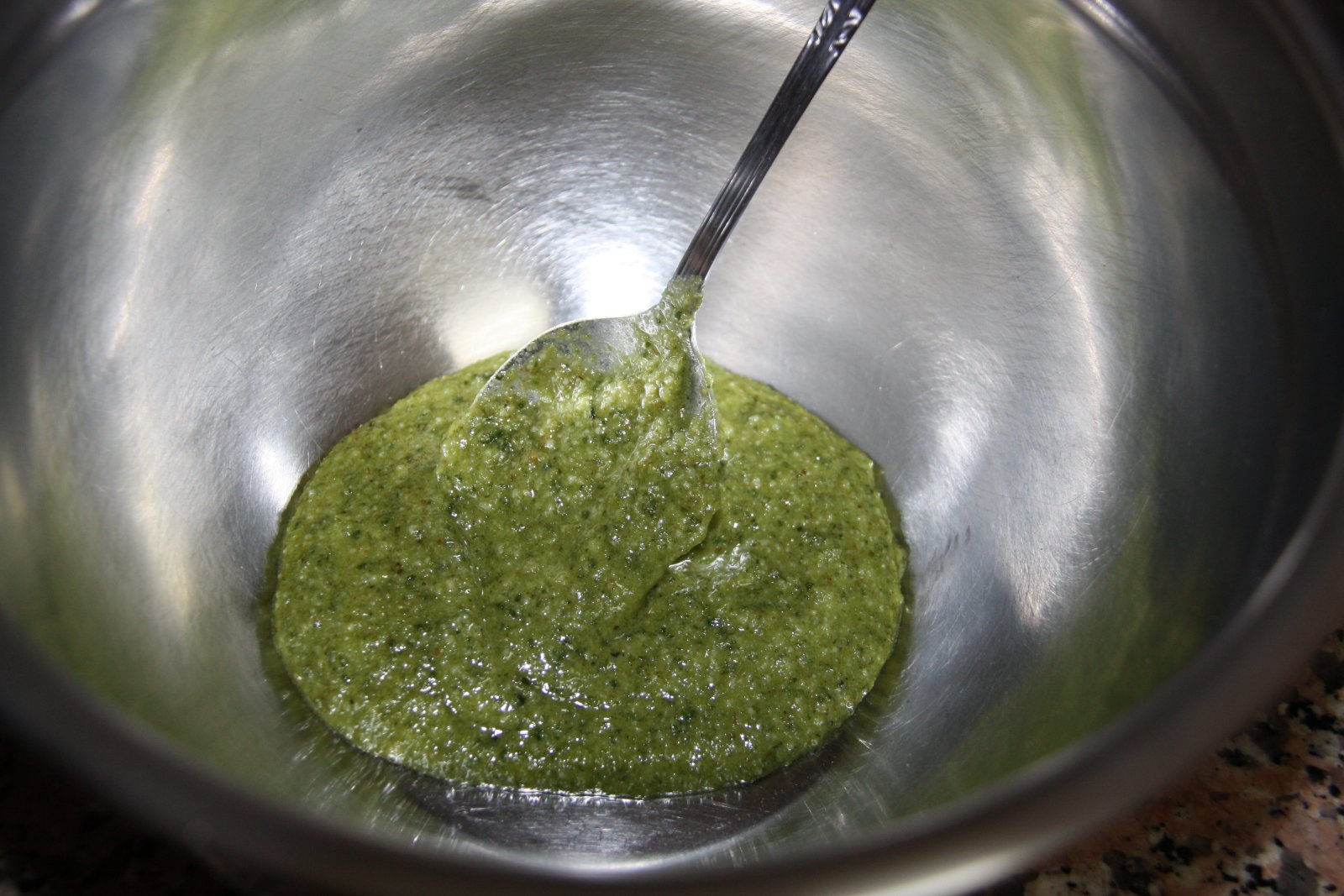 A la picadora posem la dent d’all, els pinyons, les nous i l’oli d’oliva. Ho triturem tot. Afegim les fulles d’alfàbrega i ho tornem a triturar. Per últim afegim el formatge ratllat i ho triturem altre cop. I ja tenim la salsa pesto preparada.