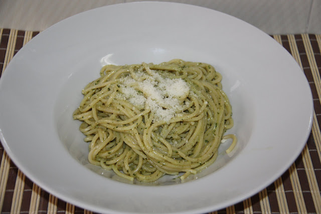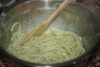 En un bol posem la quantitat desitjada de salsa pesto i afegim dos o tres cullerades soperes de l’aigua de bullir la pasta, per fer la salsa més lleugera. Afegim els espaguettis, barregem bé i repartim en plats.