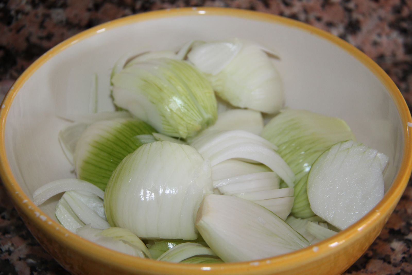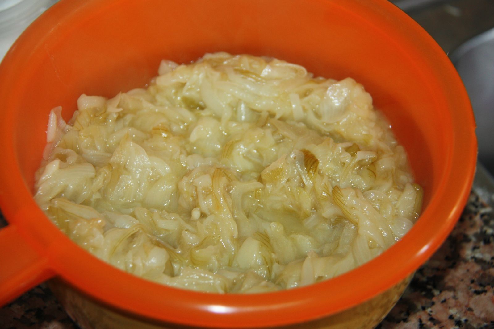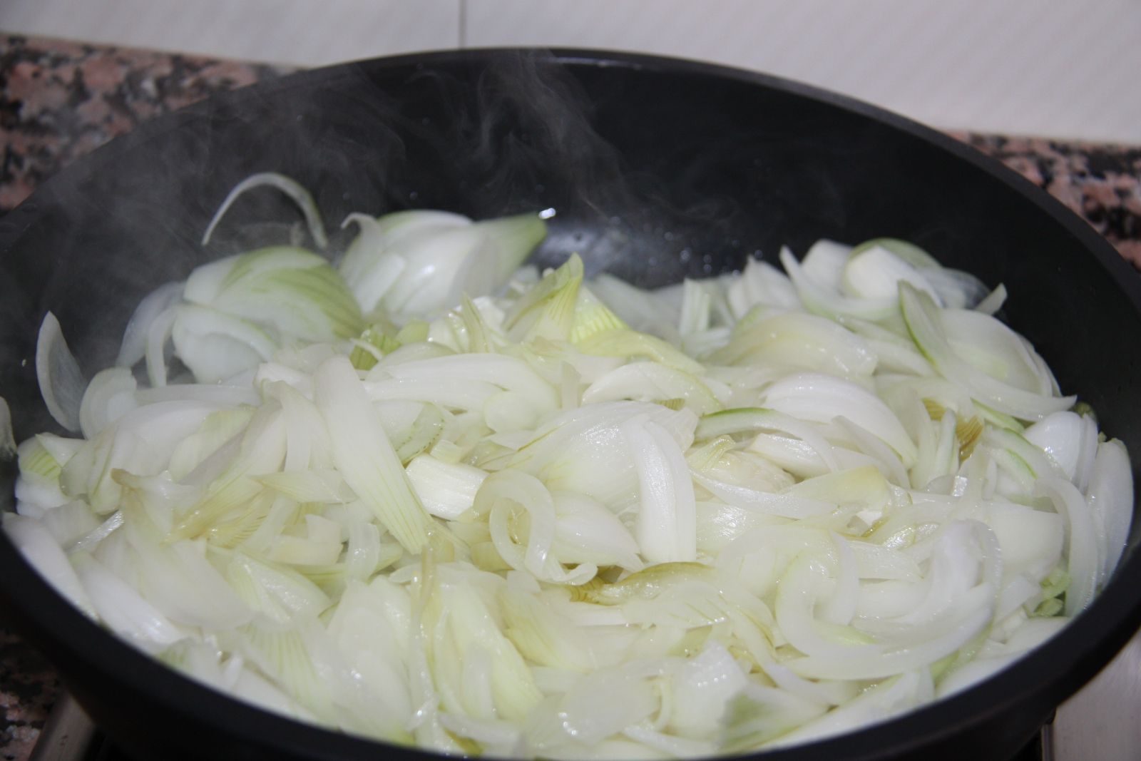 Talleu la ceba en juliana i les poseu a coure a una paella amb una mica d’oli d’oliva. L’heu de coure a foc molt lent i posant una tapa a la paella. Deixeu-la ben bé 1 hora i mitja o més, fins que estigui caramelitzada. Un cop cuita, poseu-la en un escorredor i reserveu.