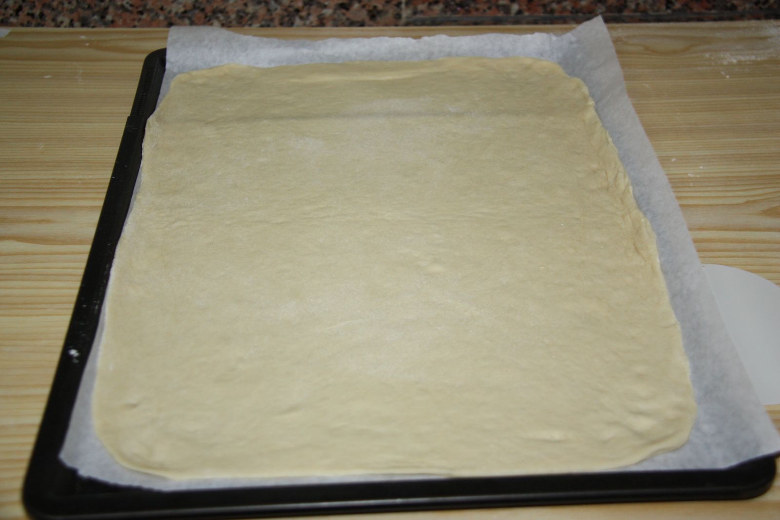Per preparar la massa desfeu la llevadura amb una mica d’aigua tèbia. Feu un volcà amb la farina (on haureu barejat la sal) i afegiu la llevadura, l’oli i l’aigua. Amasseu bé, fins aconseguir una massa ben fina i elàtica. Poseu-la en un bol i tapeu amb film transparent. Deixeu reposar uns 30 minuts.