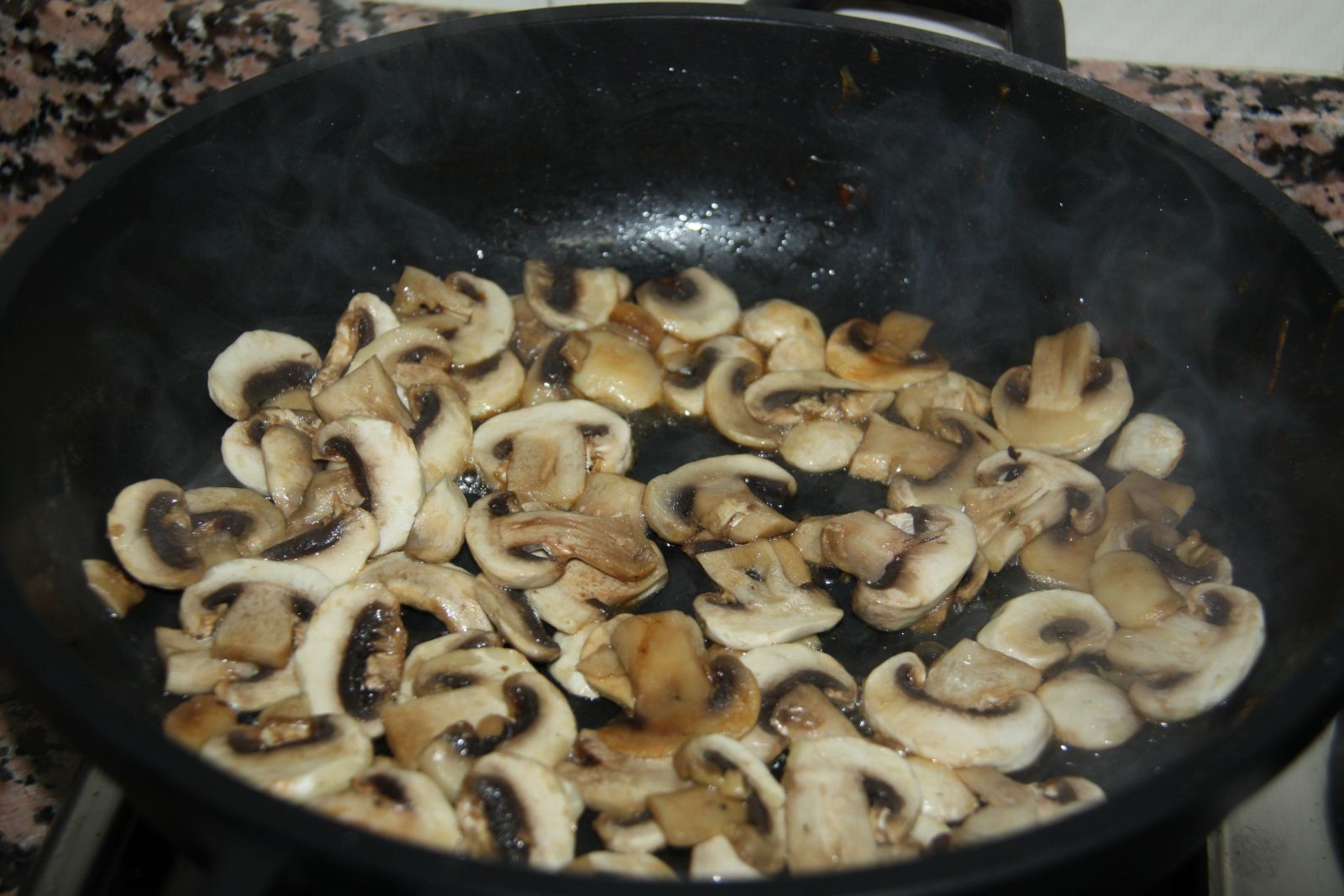Lamineu els xampinyons i fregiu-los amb una mica d’oli.