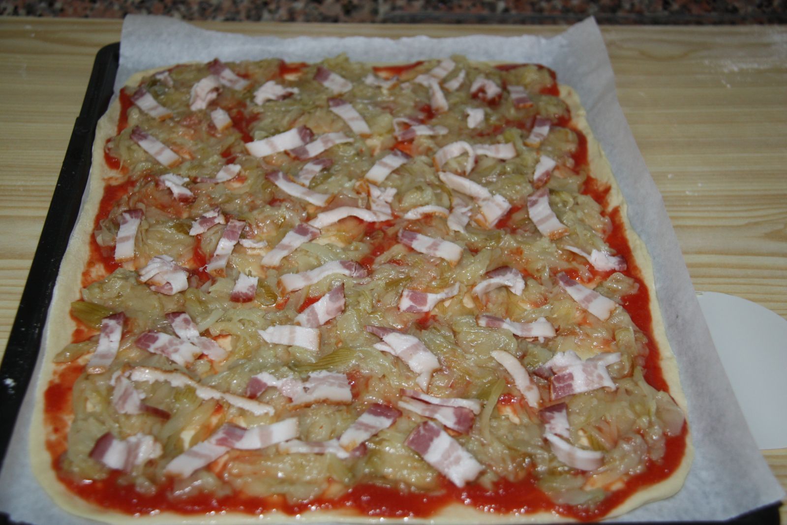 Passat el temps de llevat, doneu forma a la coca amb l’ajuda d’un corró. La massa us ha de quedar fina. Poseu al damunt una mica de tomàquet triturat, no molt. Repartiu la ceba caramelitzada, la cansalada fumada tallada a trossets petits i els xampinyons. Espolseu una mica d’orenga i per acabar repartiu la mozarella o el formatge ratllat.