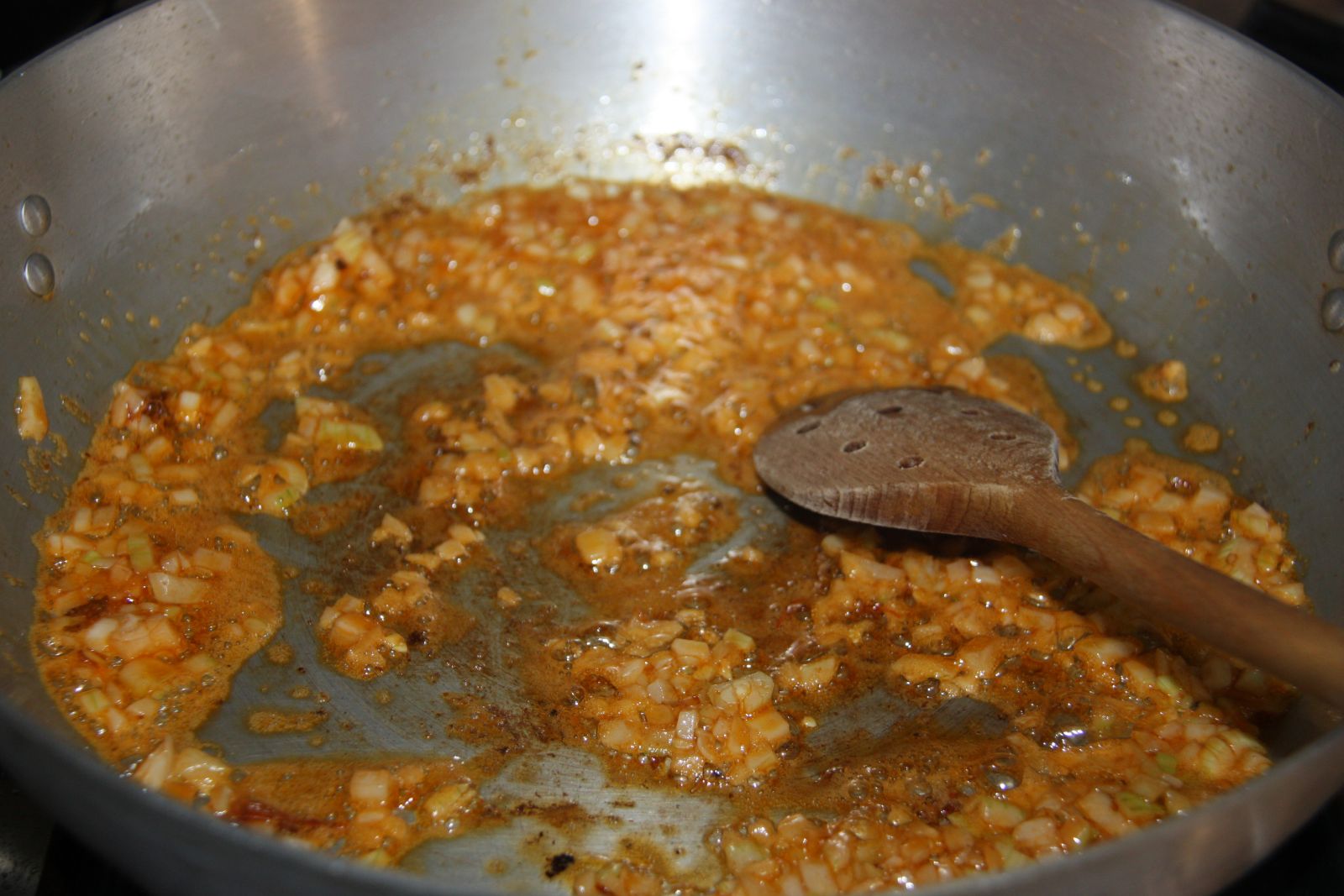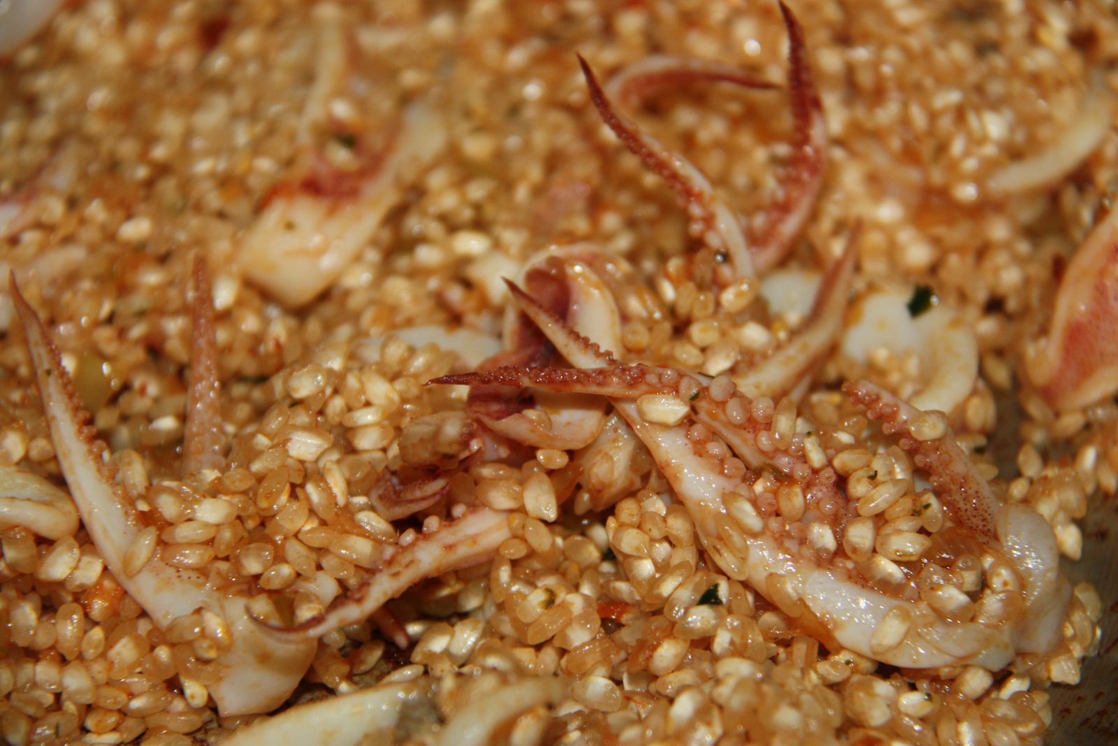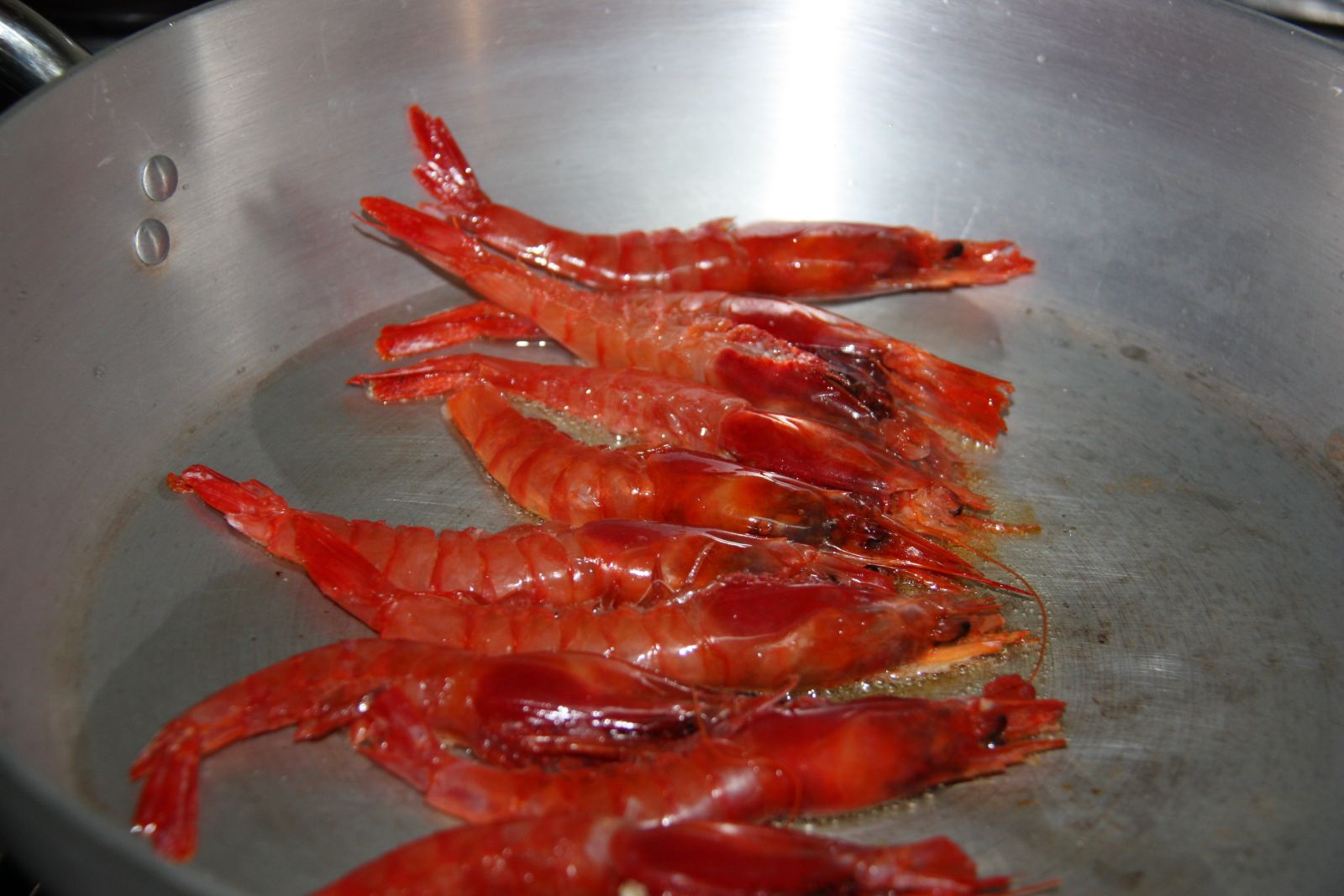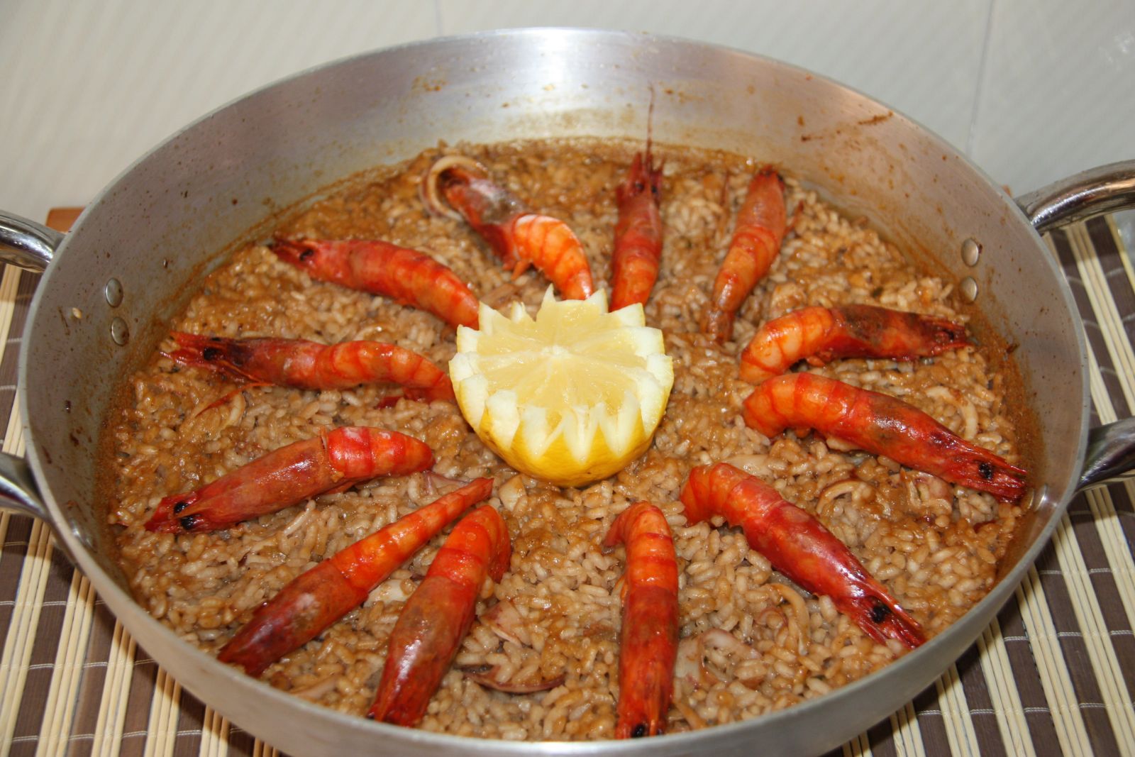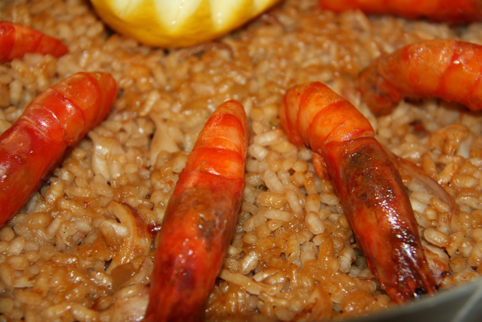 Poseu oli en una cassola o paella i daureu les gambes. Reserveu. En el mateix oli sofregiu la ceba tallada ben petita. Afegiu la picada i la sofregiu. Tot seguit, poseu les cananes tallades a trossos. Doneu-li unes voltes fins que estiguin enrossides. Per últim, incorporeu l’arròs i elsofregiu durant uns minuts.