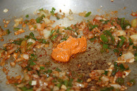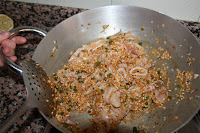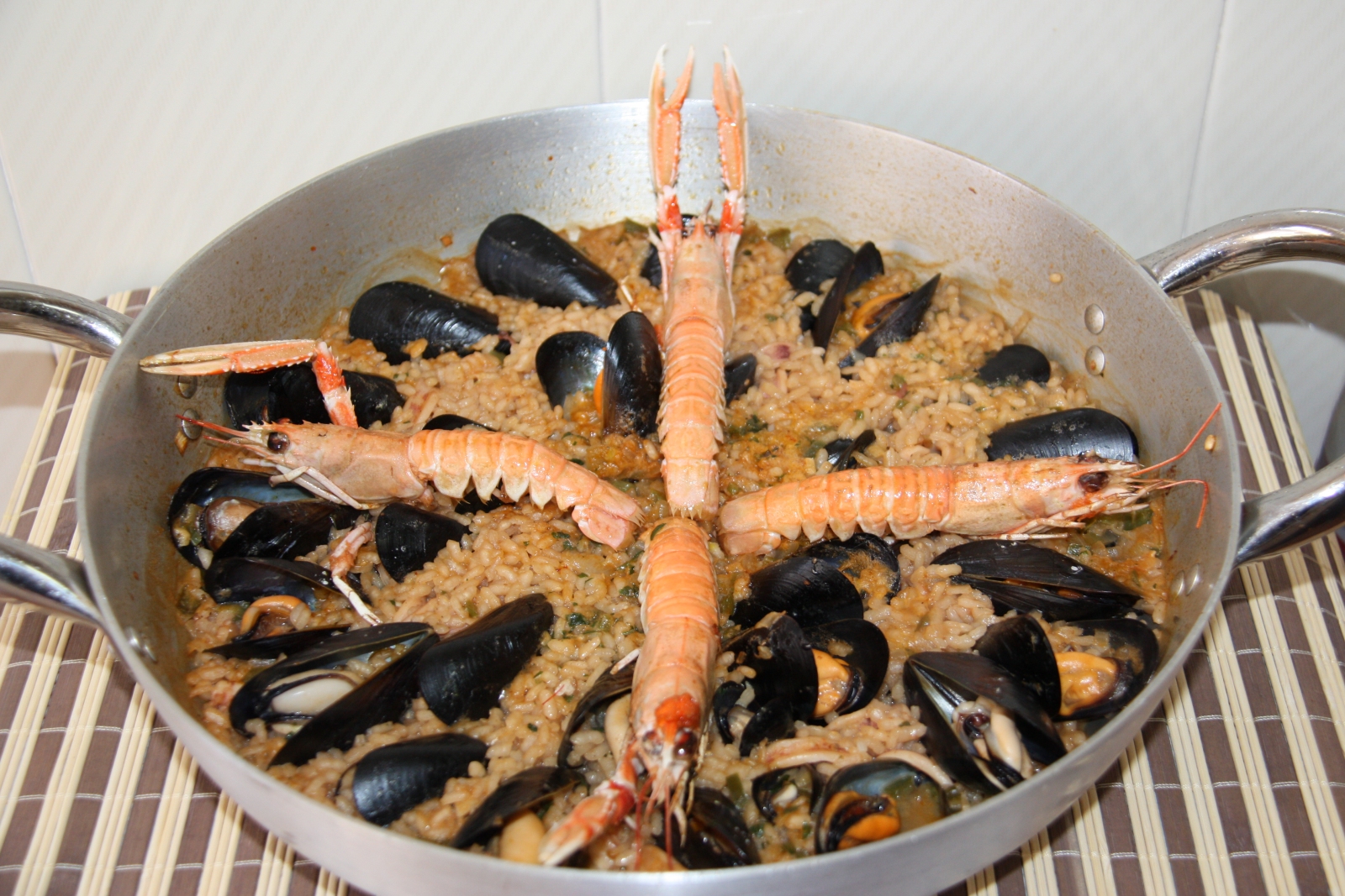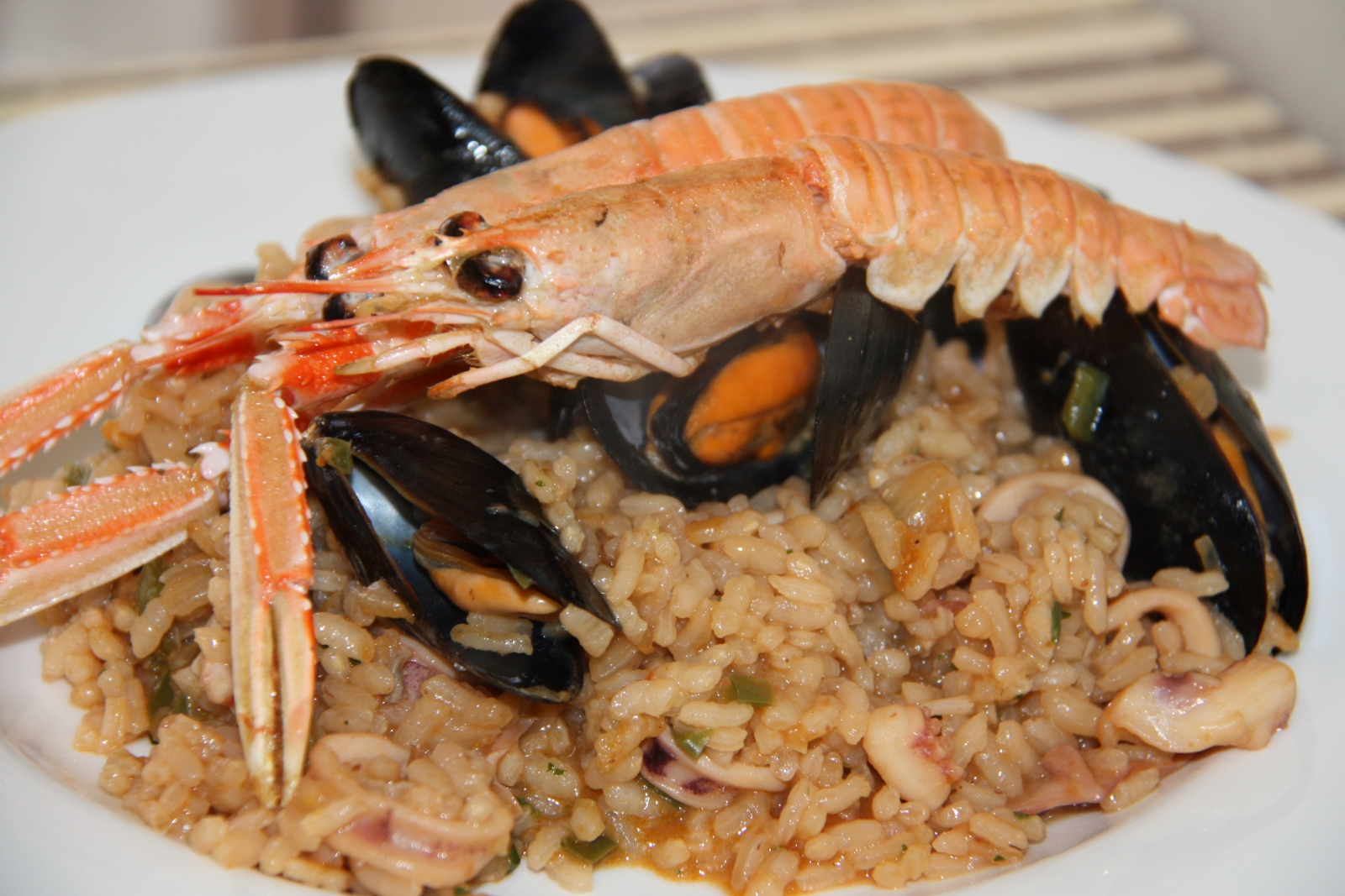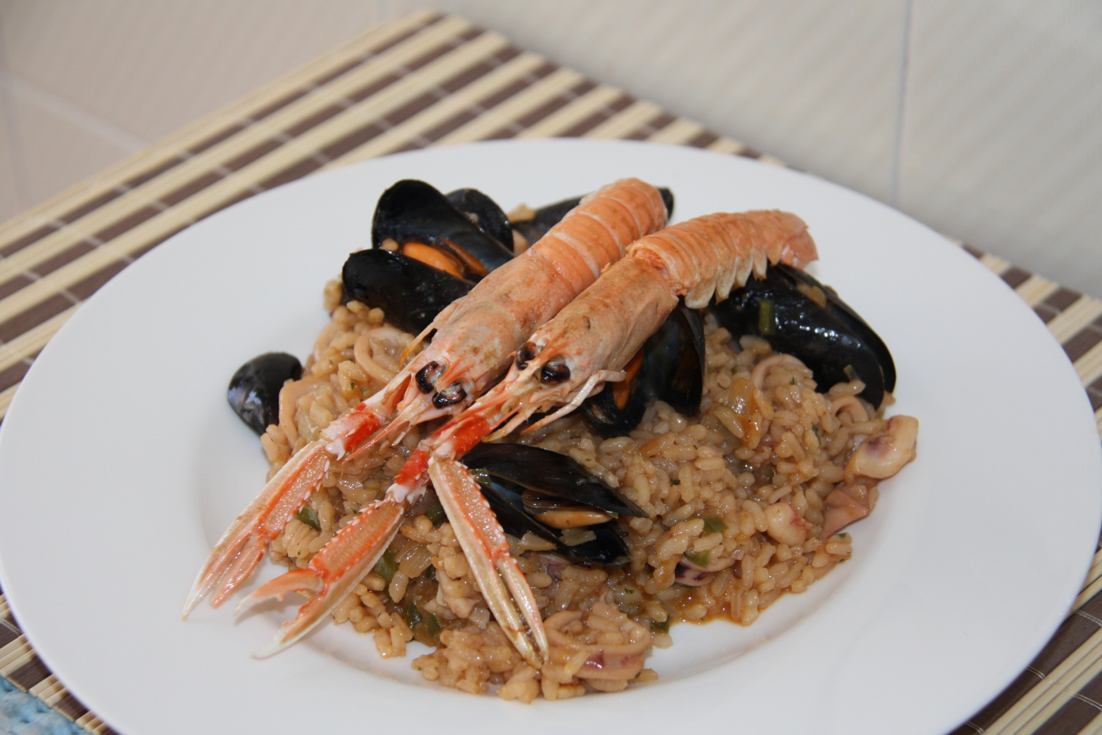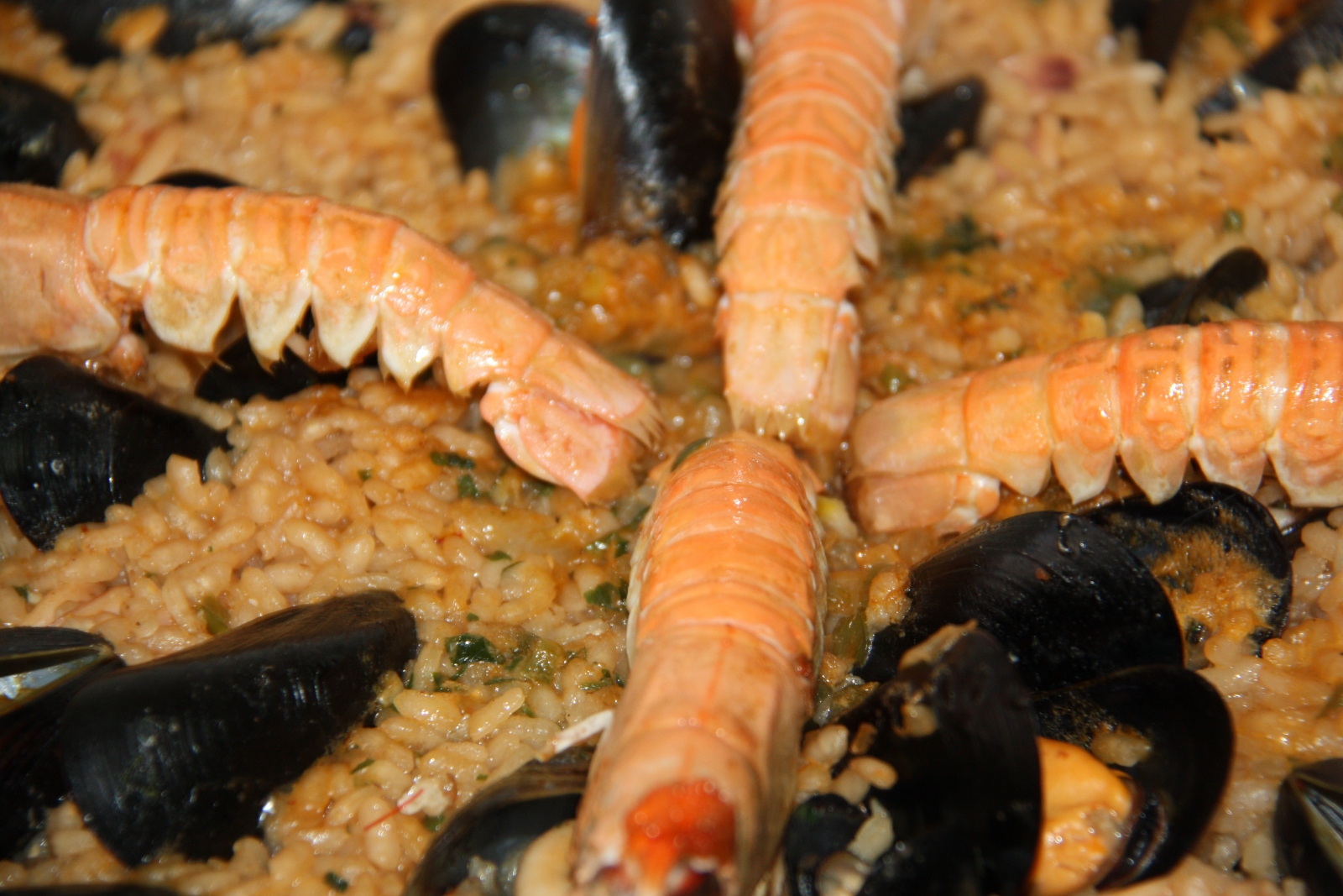 Com ens vam quedar amb ganes d’arròs, diumenge vam preparar aquesta recepta amb els ingredients que teníem al congelador (cananes, escamarlans i brou de peix) i uns musclos que vam anar a comprar a la Musclera, on els diumenges pots comprar marisc viu del Delta de l’Ebre. L’arròs és molt simple de preparar, l’únic ingredient que el fa una mica diferent de l’habitual és una cullerada de salsa romesco que vam afegir al sofregit i que li va donar una sabor molt potent a l’arròs. Per cert, vam utilitzar arròs Ricentum, de l’amic Pasqual Almudeve.