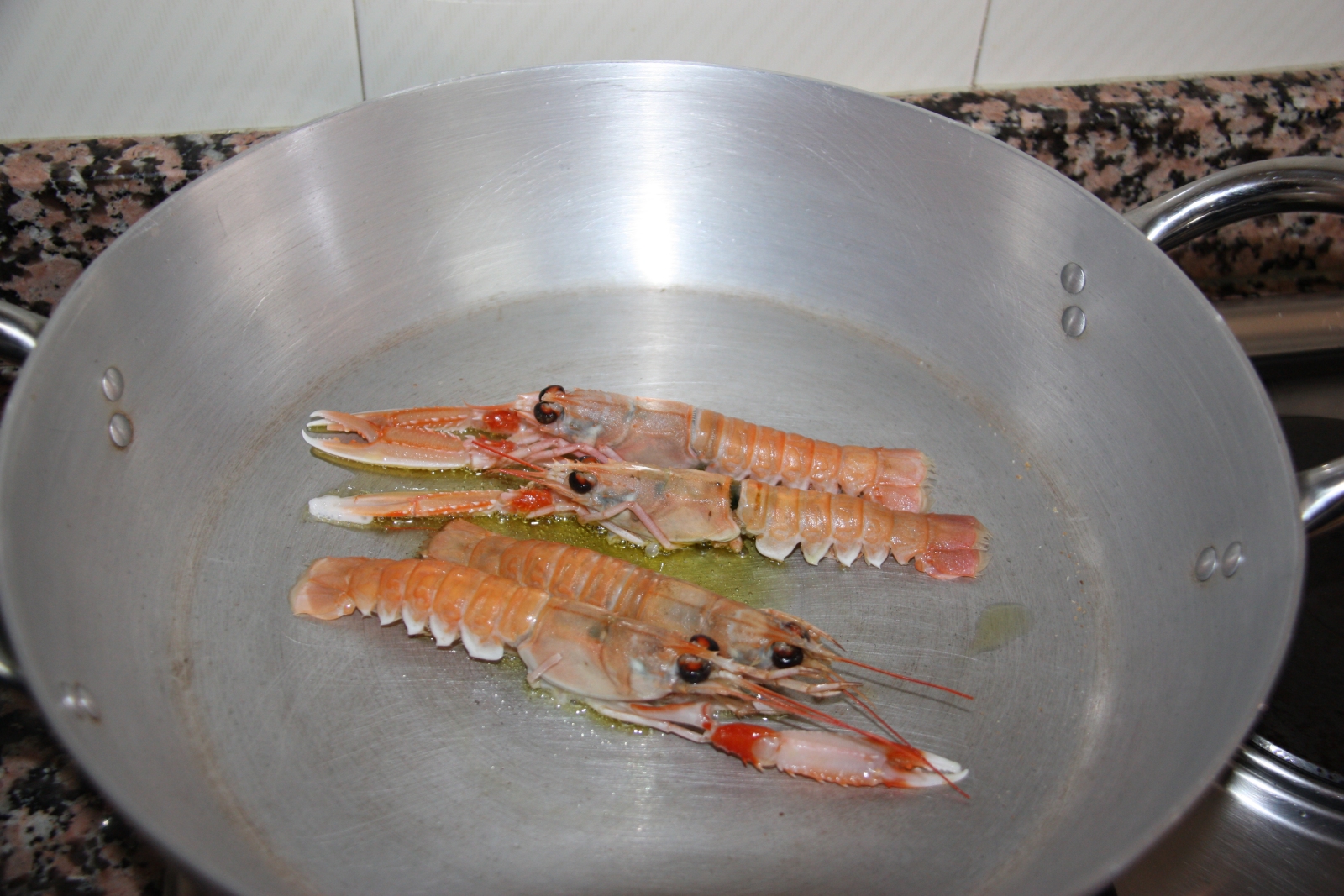 Poseu la paella al foc amb una mica d’oli i fregiu els escamarlans. Reserveu. En la mateixa paella, feu el sofregit amb la ceba, el primentó, un gra d’all i la cullerada de tomàquet triturat. Quan el sofregit estigui fet, afegiu la cullerada de salsa romesco i remeneu bé. Incorporeu les cananes tallades a trossos i deixeu enrossir durant un parell de minuts. Tot seguit afegiu l’arròs. Sofregiu-lo en dos i tres minuts. Afegiu el brou ben calent i deixeu coure 5 minuts a foc ben viu.