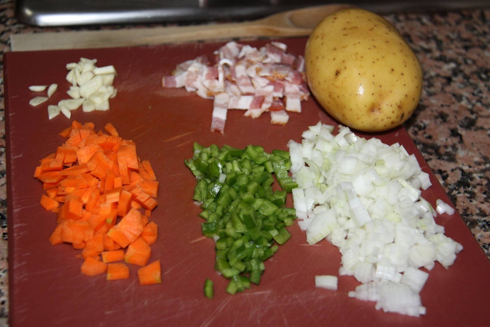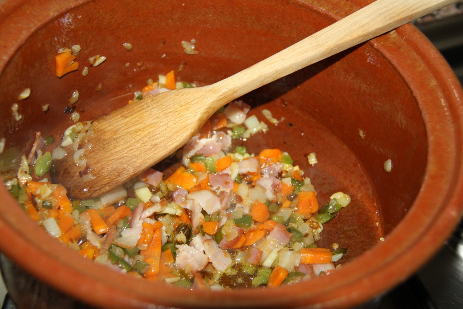 Posem una cassola al foc amb una mica d’oli d’oliva. Trinxem la ceba i la posem a la cassola que es vagi sofregint poc a poc. Quan estigui transparent, afegim el primentó verd, la carlota i l’all. Quan aquestes verdures estiguin sofregides, afegim la cansalda i després una cullerada de tomàquet triturat.