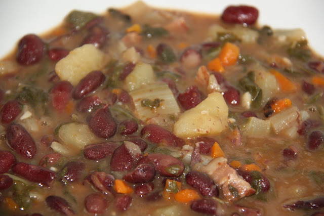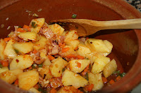 Afegim la patata a la cassola i hi tirem una culleradeta de pebre roig, remenem per evitar que es cremi. Afegim les bledes i ho cobrim amb aigua. Deixem coure fins que les patates estiguin quasi cuites. En aquest moment hi posem els fesols i ho deixem coure tot junt durant 5 minuts.