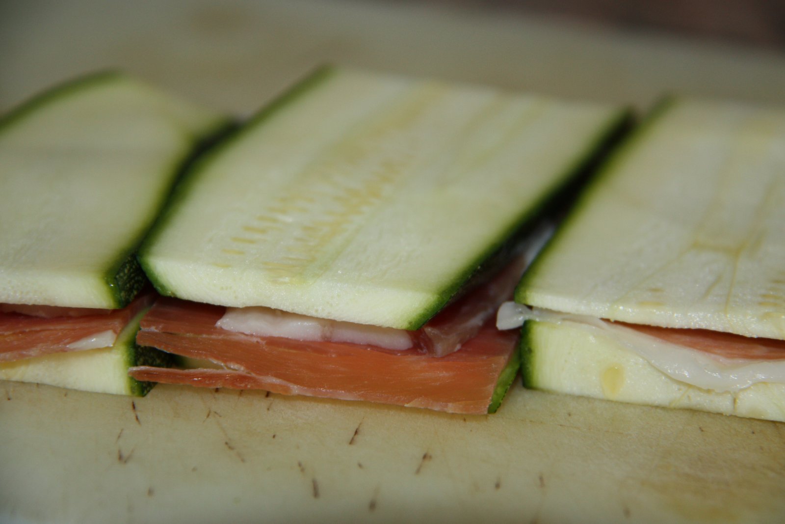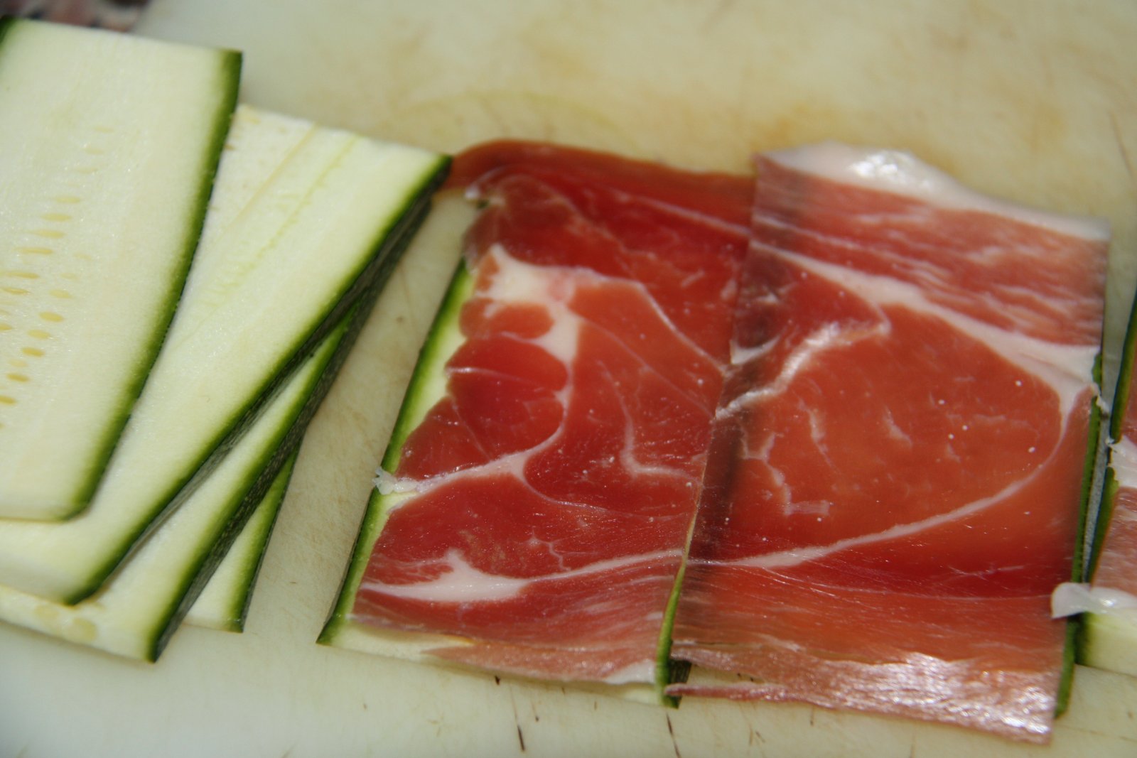 Netegeu bé i peleu només un costat del carbassó. Talleu-lo en penques primes de la mateixa mida (en número parell).
