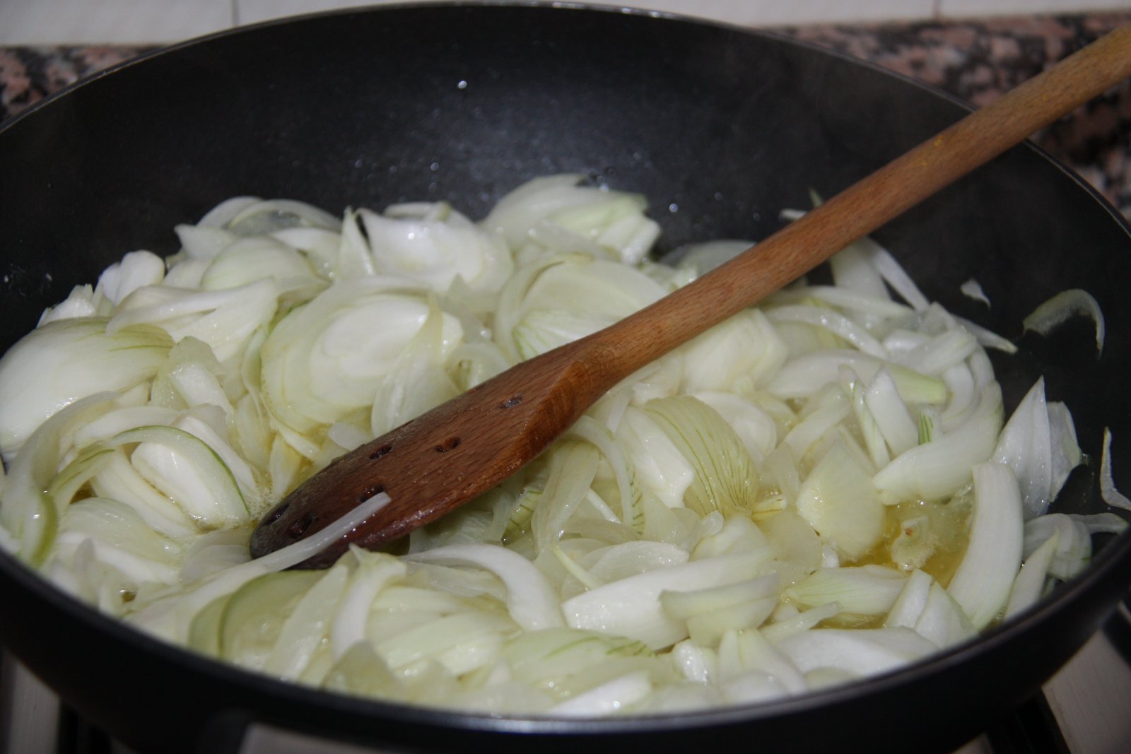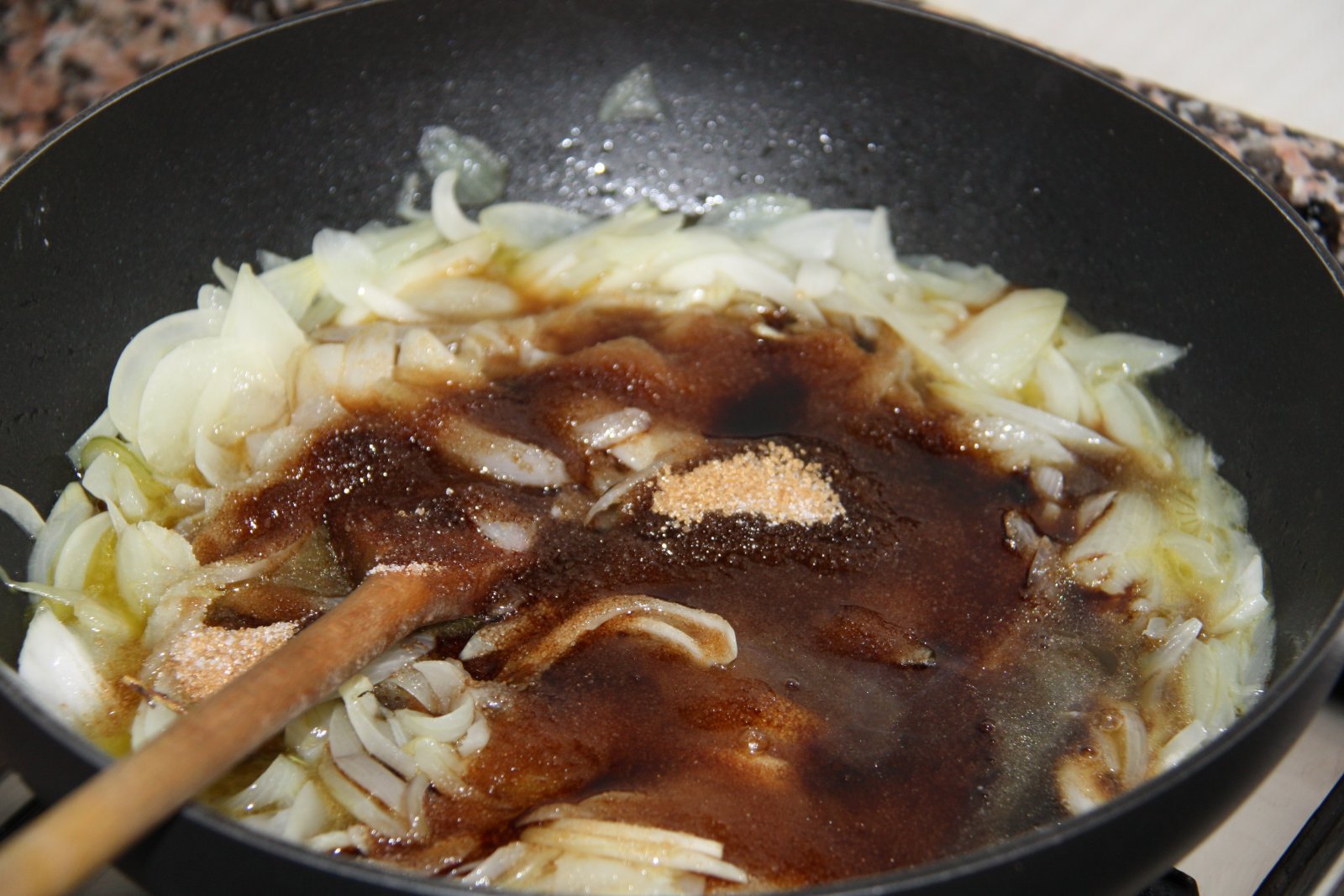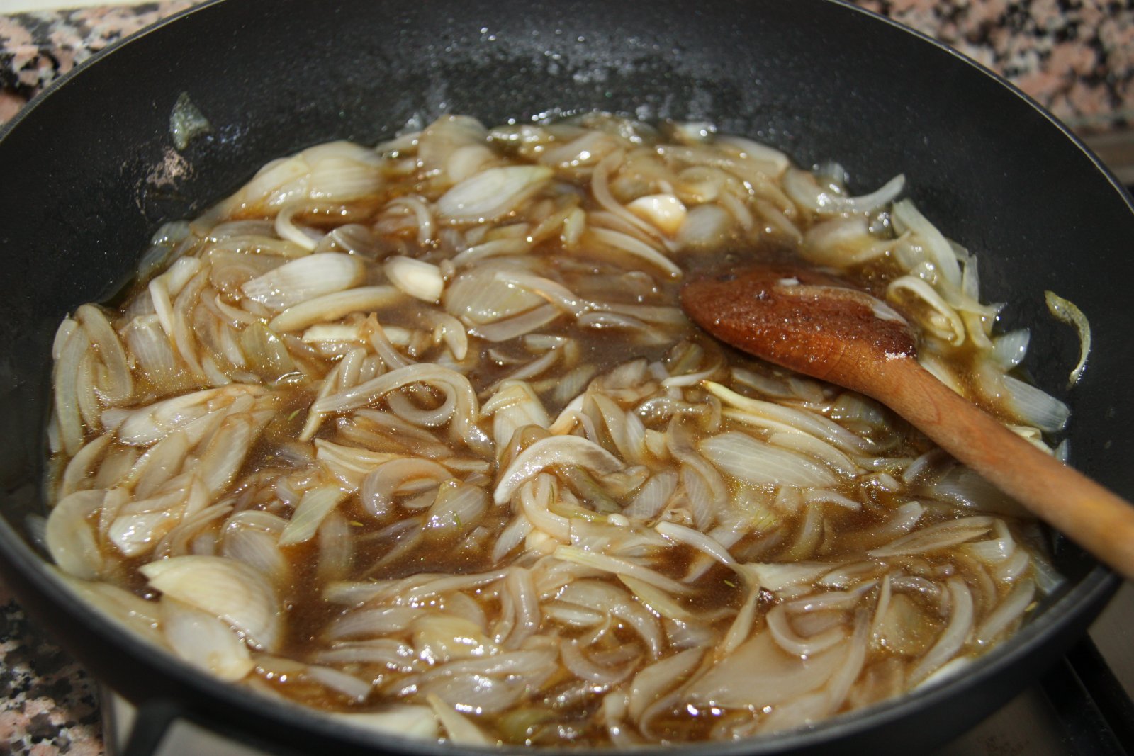 Netegeu i talleu en juliana les cebes. Poseu una paella grossa al foc amb un bon raig d’oli d’oliva. Afegiu les cebes i deixeu que es vagin estovant a foc lent. Després afegiu la resta d’ingredients i ho deixeu coure a foc lent fins que s’hagi evaporat tot el líquid i les cebes s’hagin caramelitzat. Sempre a foc suau.