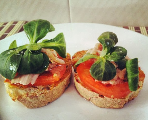Torradeta amb tomàquet, tonyina i canonges